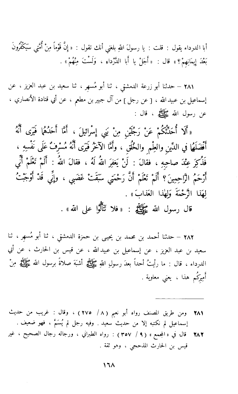 281 - حَدَّثَنَا أَبُو زُرْعَةَ الدِّمَشْقِيُّ، ثنا أَبُو مُسْهِرٍ، ثنا سَعِيدُ بْنُ عَبْدِ الْعَزِيزِ، عَنْ إِسْمَاعِيلَ بْنِ عُبَيْدِ اللَّهِ، عَنْ رَجُلٍ، مِنْ آلِ جُبَيْرِ بْنِ مُطْعِمٍ , عَنْ أَبِي قَتَادَةَ الْأَنْصَارِيِّ، عَنْ رَسُولِ اللَّهِ صَلَّى اللهُ عَلَيْهِ وَسَلَّمَ قَالَ: " أَلَا أُحَدِّثُكُمْ عَنْ رَجُلَيْنِ مِنْ بَنِي إِسْرَائِيلَ، أَمَا أَحَدُهُمَا فَيَرَى أَنَّهُ أَفْضَلُهُمَا فِي الدِّينِ وَالْعِلْمِ وَالْخُلُقِ، وَأَمَّا الْآخَرُ فَيَرَى أَنَّهُ مُسْرِفٌ عَلَى نَفْسِهِ، فَذُكِرَ عِنْدَ صَاحِبِهِ، فَقَالَ: لَنْ يَغْفِرَ اللَّهُ لَهُ، فَقَالَ اللَّهُ: «§أَلَمْ تَعْلَمْ أَنِّي أَرْحَمُ الرَّاحِمِينَ، أَلَمْ تَعْلَمْ أَنَّ رَحْمَتِي سَبَقَتْ غَضَبِي , وَإِنِّي قَدْ أَوْجَبْتُ لِهَذَا الرَّحْمَةَ وَلِهَذَا الْعَذَابَ» قَالَ رَسُولُ اللَّهِ صَلَّى اللهُ عَلَيْهِ وَسَلَّمَ: «فَلَا تَتَأَلَّوْا عَلَى اللَّهِ»