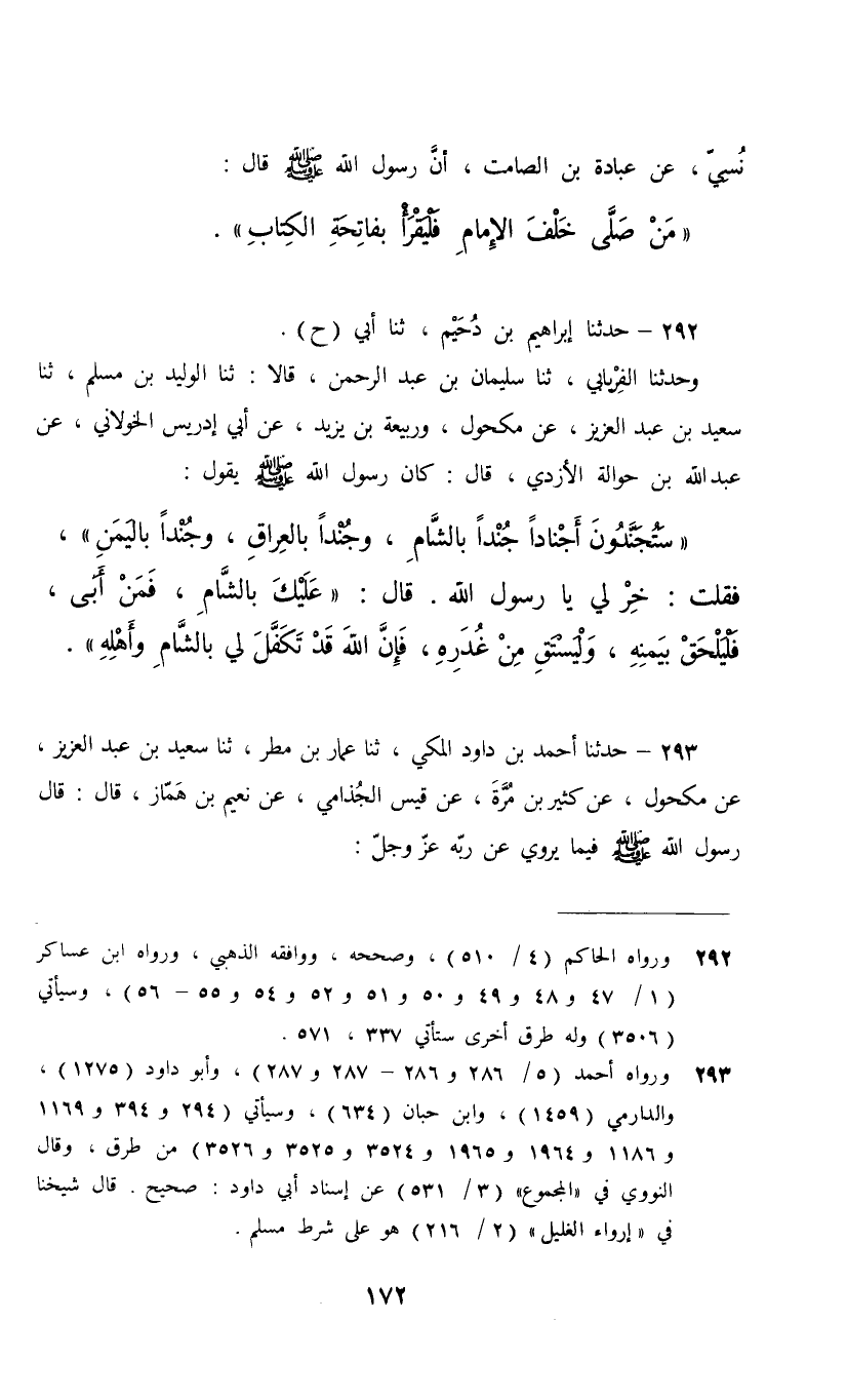 292 - حَدَّثَنَا إِبْرَاهِيمُ بْنُ دُحَيْمٍ، ثنا أَبِي، ح، وَحَدَّثَنَا الْفِرْيَابِيُّ، ثنا سُلَيْمَانُ بْنُ عَبْدِ الرَّحْمَنِ، قَالَا: ثنا الْوَلِيدُ بْنُ مُسْلِمٍ، ثنا سَعِيدُ بْنُ عَبْدِ الْعَزِيزِ، عَنْ مَكْحُولٍ، وَرَبِيعَةَ بْنِ يَزِيدَ، عَنْ أَبِي إِدْرِيسَ الْخَوْلَانِيِّ، عَنْ عَبْدِ اللَّهِ بْنِ حَوَالَةَ الْأَزْدِيِّ، قَالَ: كَانَ رَسُولُ اللَّهِ صَلَّى اللهُ عَلَيْهِ وَسَلَّمَ يَقُولُ: " §سَتُجَنِّدُونَ أَجْنَادًا: جُنْدًا بِالشَّامِ وَجُنْدًا بِالْعِرَاقِ وَجُنْدًا بِالْيَمَنِ " فَقُلْتَ: خِرْ لِي يَا رَسُولَ اللَّهِ قَالَ: «عَلَيْكَ بِالشَّامِ فَمَنْ أَبَى فَلْيَلْحَقْ بِيَمَنِهِ، وَلْيَسْتَقِ مِنْ غُدُرِهِ فَإِنَّ اللَّهَ قَدْ تَكَفَّلَ لِي بِالشَّامِ وَأَهْلِهِ»