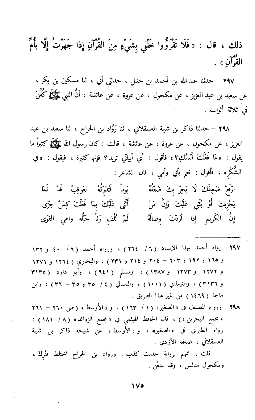 297 - حَدَّثَنَا عَبْدُ اللَّهِ بْنُ أَحْمَدَ بْنِ حَنْبَلٍ، حَدَّثَنِي أَبِي، ثنا مِسْكِينُ بْنُ بَكْرٍ، عَنْ سَعِيدِ بْنِ عَبْدِ الْعَزِيزِ، عَنْ مَكْحُولٍ، عَنْ عُرْوَةَ، عَنْ عَائِشَةَ، أَنَّ النَّبِيَّ صَلَّى اللهُ عَلَيْهِ وَسَلَّمَ §«كُفِّنَ فِي ثَلَاثَةِ أَثْوَابٍ»