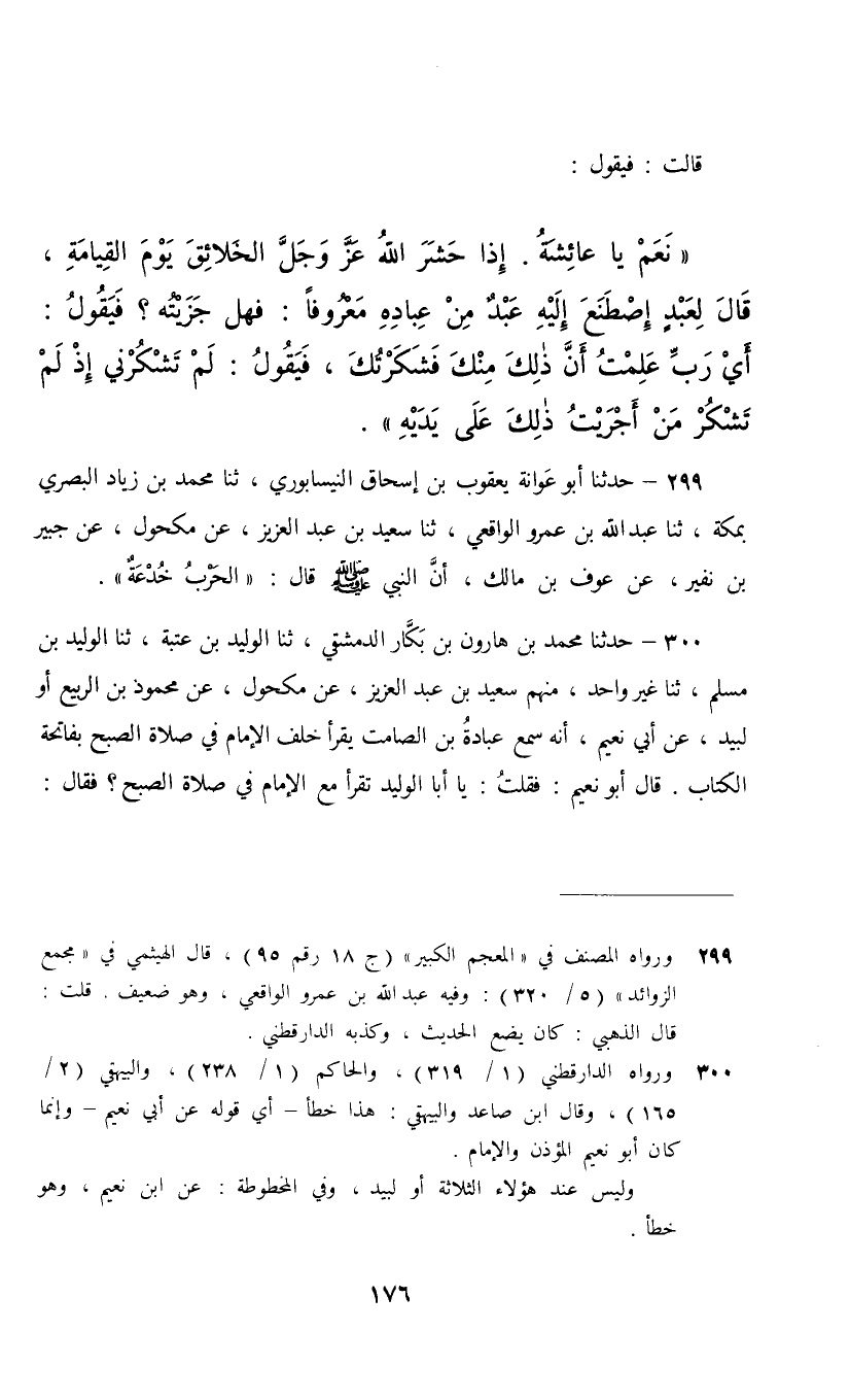 300 - حَدَّثَنَا مُحَمَّدُ بْنُ هَارُونَ بْنِ بَكَّارٍ الدِّمَشْقِيُّ، ثنا الْوَلِيدُ بْنُ عُتْبَةَ، ثنا الْوَلِيدُ بْنُ مُسْلِمٍ، ثنا غَيْرُ وَاحِدٍ، مِنْهُمْ سَعِيدُ بْنُ عَبْدِ الْعَزِيزِ، عَنْ مَكْحُولٍ، عَنْ مَحْمُودِ بْنِ الرَّبِيعِ، أَوْ لَبِيدٍ عَنْ أَبِي نُعَيْمٍ، أَنَّهُ سَمِعَ عُبَادَةَ بْنَ الصَّامِتِ، يَقْرَأُ خَلْفَ الْإِمَامِ فِي صَلَاةِ الصُّبْحِ بِفَاتِحَةِ الْكِتَابِ , قَالَ أَبُو نُعَيْمٍ: فَقُلْتُ: يَا أَبَا الْوَلِيدِ تَقْرَأُ مَعَ الْإِمَامِ فِي صَلَاةِ الصُّبْحِ فَقَالَ: نَعَمْ إِنَّ رَسُولَ اللَّهِ صَلَّى اللهُ عَلَيْهِ وَسَلَّمَ قَالَ لَنَا: «هَلْ تَقْرَءُونَ فِي الصَّلَاةِ مَعِي؟» قُلْنَا نَعَمْ قَالَ: §لَا تَفْعَلُوا إِلَّا بِفَاتِحَةِ الْكِتَابِ "