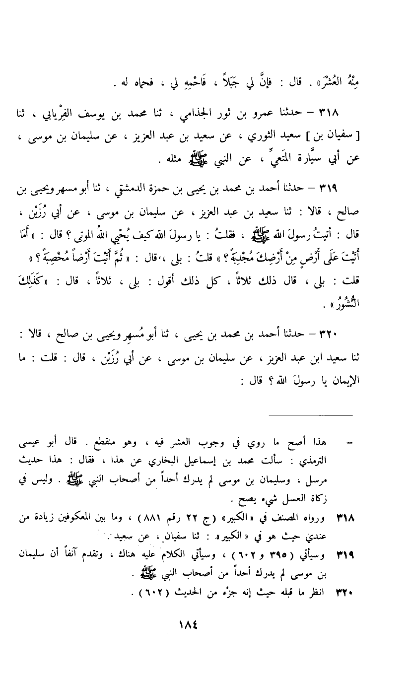 319 - حَدَّثَنَا أَحْمَدُ بْنُ مُحَمَّدِ بْنِ يَحْيَى بْنِ حَمْزَةَ الدِّمَشْقِيُّ، ثنا أَبُو مُسْهِرٍ، وَيَحْيَى بْنُ صَالِحٍ، قَالَا: ثنا سَعِيدُ بْنُ عَبْدِ الْعَزِيزِ، عَنْ سُلَيْمَانَ بْنِ مُوسَى، عَنْ أَبِي رَزِينٍ، قَالَ: أَتَيْتُ رَسُولَ اللَّهِ صَلَّى اللهُ عَلَيْهِ وَسَلَّمَ فَقُلْتُ: يَا رَسُولَ اللَّهِ كَيْفَ يُحْيِي اللَّهُ الْمَوْتَى قَالَ: " §أَمَا أَتَيْتَ عَلَى أَرْضٍ مِنْ أَرْضِكَ مُجْدِبَةٍ؟ قُلْتُ: بَلَى , قَالَ: " ثُمَّ أَتَيْتَ أَرْضًا مُخْصِبَةً , قُلْتُ بَلَى , قَالَ: ذَلِكَ ثَلَاثًا , كُلُّ ذَلِكَ أَقُولُ بَلَى , ثَلَاثًا , قَالَ: كَذَلِكَ النُّشُورُ "