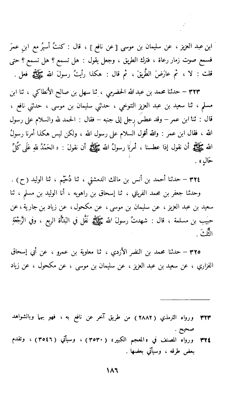 323 - حَدَّثَنَا مُحَمَّدُ بْنُ عَبْدِ اللَّهِ الْحَضْرَمِيُّ، ثنا سَهْلُ بْنُ صَالِحٍ الْأَنْطَاكِيُّ، ثنا ابْنُ مُسْلِمٍ، ثنا سَعِيدُ بْنُ عَبْدِ الْعَزِيزِ التَّنُوخِيُّ، حَدَّثَنِي سُلَيْمَانُ بْنُ مُوسَى , حَدَّثَنِي نَافِعٌ، قَالَ: ثنا ابْنُ عُمَرَ، وَقَدْ §عَطَسَ رَجُلٌ إِلَى جَنْبِهِ فَقَالَ: الْحَمْدُ لِلَّهِ وَالسَّلَامُ عَلَى رَسُولِ اللَّهِ، فَقَالَ ابْنُ عُمَرَ " وَاللَّهِ أَقُولُ: السَّلَامُ عَلَى رَسُولِ اللَّهِ، وَلَكِنْ لَيْسَ هَكَذَا أَمَرَنَا رَسُولُ اللَّهِ صَلَّى اللهُ عَلَيْهِ وَسَلَّمَ أَنْ نَقُولَ إِذَا عَطَسْنَا , أَمَرَنَا رَسُولُ اللَّهِ صَلَّى اللهُ عَلَيْهِ وَسَلَّمَ أَنْ نَقُولَ: «الْحَمْدُ لِلَّهِ عَلَى كُلِّ حَالٍ»