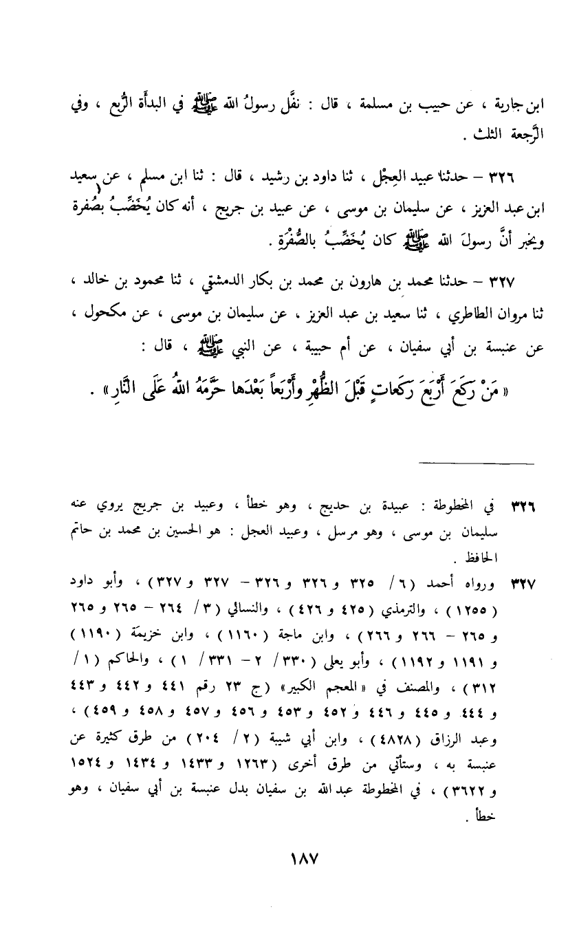 327 - حَدَّثَنَا مُحَمَّدُ بْنُ هَارُونَ بْنِ مُحَمَّدِ بْنِ بَكَّارٍ الدِّمَشْقِيُّ، ثنا مَحْمُودُ بْنُ خَالِدٍ، ثنا مَرْوَانُ الطَّاطَرِيُّ، ثنا سَعِيدُ بْنُ عَبْدِ الْعَزِيزِ، عَنْ سُلَيْمَانَ بْنِ مُوسَى، عَنْ مَكْحُولٍ، عَنْ عَنْبَسَةَ بْنِ أَبِي سُفْيَانَ، عَنْ أُمِّ حَبِيبَةَ، عَنِ النَّبِيِّ صَلَّى اللهُ عَلَيْهِ وَسَلَّمَ قَالَ: §«مَنْ رَكَعَ أَرْبَعَ رَكَعَاتٍ قَبْلَ الظُّهْرِ وَأَرْبَعًا بَعْدَهَا حَرَّمَهُ اللَّهُ عَلَى النَّارِ»