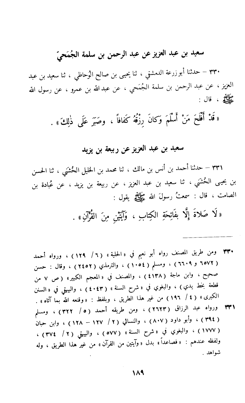 330 - حَدَّثَنَا أَبُو زُرْعَةَ الدِّمَشْقِيُّ، ثنا يَحْيَى بْنُ صَالِحٍ الْوُحَاظِيُّ، ثنا سَعِيدُ بْنُ عَبْدِ الْعَزِيزِ، عَنْ عَبْدِ الرَّحْمَنِ بْنِ سَلَمَةَ الْجُمَحِيِّ، عَنْ عَبْدِ اللَّهِ بْنِ عَمْرٍو، عَنْ رَسُولِ اللَّهِ صَلَّى اللهُ عَلَيْهِ وَسَلَّمَ قَالَ: «قَدْ أَفْلَحَ مَنْ أَسْلَمَ وَكَانَ رِزْقُهُ كَفَافًا وَصَبَرَ عَلَى ذَلِكَ»
