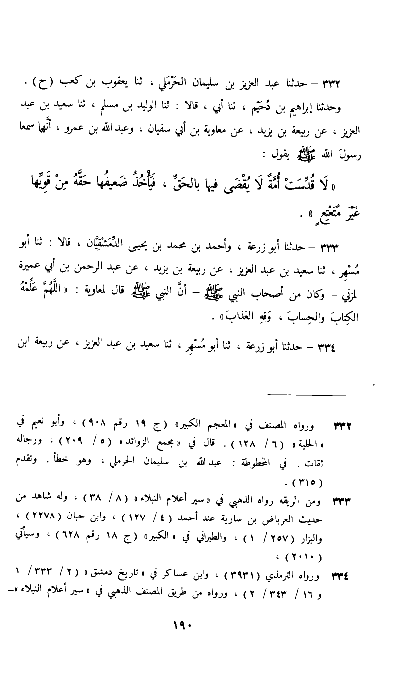 333 - حَدَّثَنَا أَبُو زُرْعَةَ، وَأَحْمَدُ بْنُ مُحَمَّدِ بْنِ يَحْيَى الدِّمَشْقِيَّانِ قَالَا: ثنا أَبُو مُسْهِرٍ، ثنا سَعِيدُ بْنُ عَبْدِ الْعَزِيزِ، عَنْ رَبِيعَةَ بْنِ يَزِيدَ، عَنْ عَبْدِ الرَّحْمَنِ بْنِ أَبِي عَمِيرَةَ الْمُزَنِيِّ، وَكَانَ مِنْ أَصْحَابِ النَّبِيِّ صَلَّى اللهُ عَلَيْهِ وَسَلَّمَ أَنَّ النَّبِيَّ صَلَّى اللهُ عَلَيْهِ وَسَلَّمَ قَالَ لِمُعَاوِيَةَ: §«اللَّهُمَّ عَلِّمْهُ الْكِتَابَ وَالْحِسَابَ وَقِهِ الْعَذَابَ»