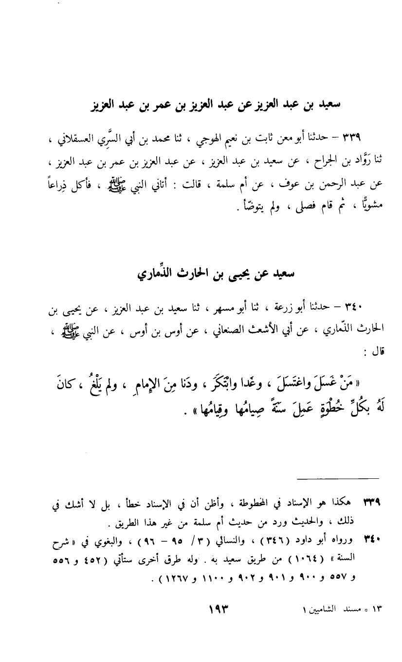 340 - حَدَّثَنَا أَبُو زُرْعَةَ، ثنا أَبُو مُسْهِرٍ، ثنا سَعِيدُ بْنُ عَبْدِ الْعَزِيزِ، عَنْ يَحْيَى بْنِ الْحَارِثِ الذِّمَارِيِّ، عَنْ أَبِي الْأَشْعَثَ الصَّنْعَانِيِّ، عَنْ أَوْسِ بْنِ أَوْسٍ، عَنِ النَّبِيِّ صَلَّى اللهُ عَلَيْهِ وَسَلَّمَ قَالَ: §«مَنْ غَسَلَ وَاغْتَسَلَ , وَغَدَا وَابْتَكَرَ وَدَنَا مِنَ الْإِمَامِ وَلَمْ يَلْغُ كَانَ لَهُ بِكُلِّ خُطْوَةٍ عَمَلُ سَنَةٍ صِيَامُهَا وَقِيَامُهَا»