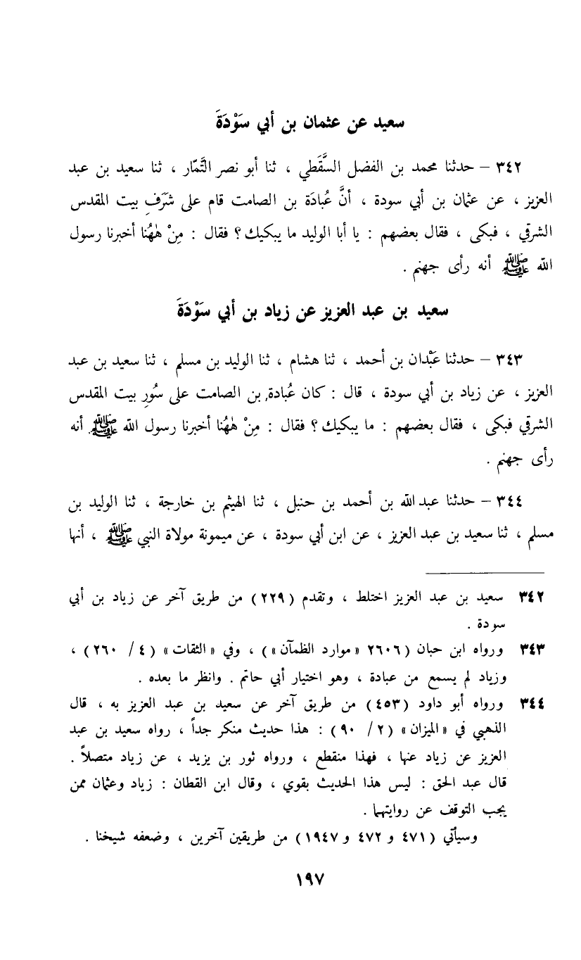 342 - حَدَّثَنَا مُحَمَّدُ بْنُ الْفَضْلِ السَّقَطِيُّ، ثنا أَبُو نَصْرٍ التَّمَّارُ، ثنا سَعِيدُ بْنُ عَبْدِ الْعَزِيزِ، عَنْ عُثْمَانَ بْنِ أَبِي سَوْدَةَ، أَنَّ عُبَادَةَ بْنَ الصَّامِتِ، قَامَ عَلَى شَرَفِ بَيْتِ الْمَقْدِسِ الشَّرْقِيِّ فَبَكَى , فَقَالَ بَعْضُهُمْ: يَا أَبَا الْوَلِيدِ مَا يُبْكِيكَ؟ فَقَالَ: «مِنْ هَهُنَا أَخْبَرَنَا رَسُولُ اللَّهِ صَلَّى اللهُ عَلَيْهِ وَسَلَّمَ أَنَّهُ §رَأَى جَهَنَّمَ»