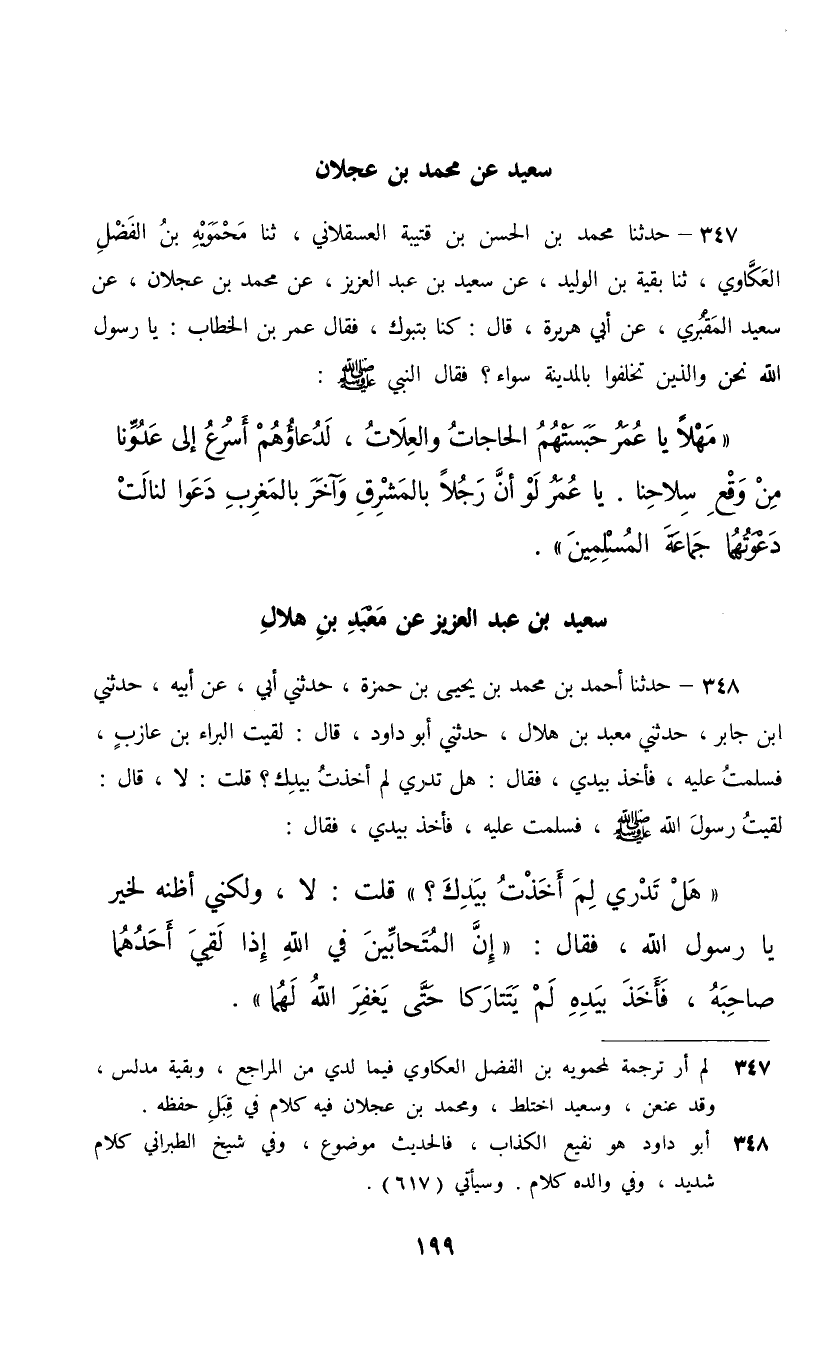 348 - حَدَّثَنَا أَحْمَدُ بْنُ مُحَمَّدِ بْنِ يَحْيَى بْنِ حَمْزَةَ، حَدَّثَنِي أَبِي، عَنْ أَبِيهِ، حَدَّثَنِي ابْنُ جَابِرٍ، حَدَّثَنِي مَعْبَدُ بْنُ هِلَالٍ، حَدَّثَنِي أَبُو دَاوُدَ، قَالَ: لَقِيتُ الْبَرَاءَ بْنَ عَازِبٍ فَسَلَّمْتُ عَلَيْهِ فَأَخَذَ بِيَدِي فَقَالَ: هَلْ تَدْرِي لِمَ أَخَذْتُ بِيَدِكَ؟ قُلْتُ: لَا , قَالَ: لَقِيتُ رَسُولَ اللَّهِ صَلَّى اللهُ عَلَيْهِ وَسَلَّمَ فَسَلَّمْتُ عَلَيْهِ فَأَخَذَ بِيَدِي فَقَالَ: " هَلْ تَدْرِي لِمَ أَخَذُتُ بِيَدِكَ؟ قُلْتُ: لَا وَلَكِنِّي أَظُنُّهُ لَخَيْرٌ يَا رَسُولَ اللَّهِ فَقَالَ: «إِنَّ §الْمُتَحَابِّينَ فِي اللَّهِ إِذَا لَقِيَ أَحَدُهُمَا صَاحِبَهُ فَأَخَذَ بِيَدِهِ لَمْ يَتَتَارَكَا حَتَّى يَغْفِرَ اللَّهُ لَهُمَا»