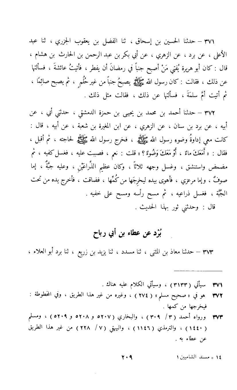 371 - حَدَّثَنَا الْحُسَيْنُ بْنُ إِسْحَاقَ، ثنا الْفَضْلُ بْنُ يَعْقُوبَ الْجَزَرِيُّ، ثنا عَبْدُ الْأَعْلَى، عَنْ بُرْدٍ، عَنِ الزُّهْرِيِّ، عَنْ أَبِي بَكْرِ بْنِ عَبْدِ الرَّحْمَنِ بْنِ الْحَارِثِ بْنِ هِشَامٍ، قَالَ: كَانَ أَبُو هُرَيْرَةَ يُفْتِي مَنْ أَصْبَحَ جُنُبًا فِي رَمَضَانَ أَنْ يُفْطِرَ , فَأَتَيْتُ عَائِشَةَ فَسَأَلْتُهَا عَنْ ذَلِكَ فَقَالَتْ: كَانَ رَسُولُ اللَّهِ صَلَّى اللهُ عَلَيْهِ وَسَلَّمَ §يُصْبِحُ جُنُبًا مِنْ غَيْرِ حُلُمٍ ثُمَّ يُصْبِحُ صَائِمًا , ثُمَّ أَتَيْتُ أُمَّ سَلَمَةَ فَسَأَلْتُهَا عَنْ ذَلِكَ , فَقَالَتْ مِثْلَ ذَلِكَ