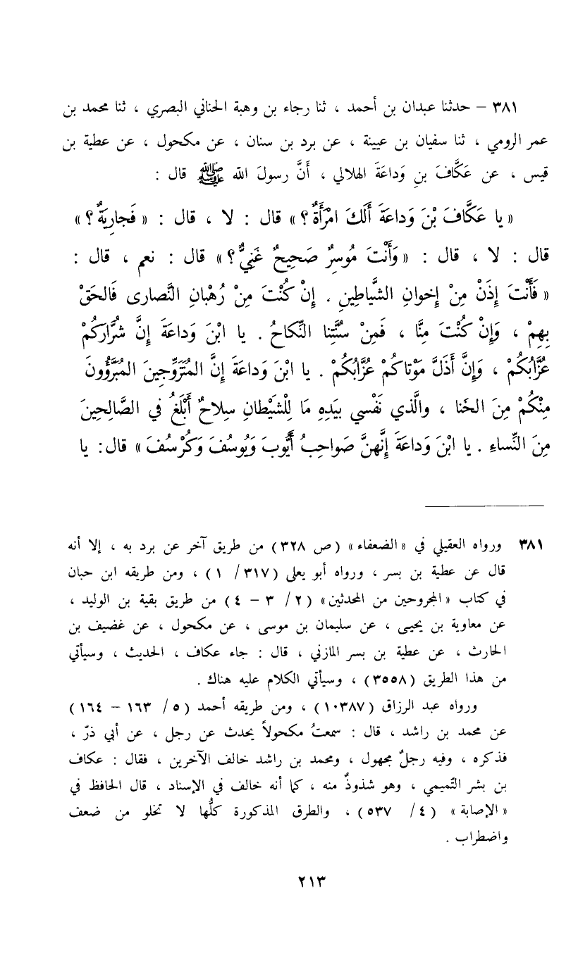 381 - حَدَّثَنَا عَبْدَانُ بْنُ أَحْمَدَ، ثنا رَجَاءُ بْنُ وَهَبَةَ الْحَنَانِيُّ الْبَصْرِيُّ، ثنا مُحَمَّدُ بْنُ عُمَرَ الرُّومِيُّ، ثنا سُفْيَانُ بْنُ عُيَيْنَةَ، عَنْ بُرْدِ بْنِ سِنَانٍ، عَنْ مَكْحُولٍ، عَنْ عَطِيَّةَ بْنِ قَيْسٍ، عَنْ عَكَّافِ بْنِ وَدَاعَةَ الْهِلَالِيُّ، أَنَّ رَسُولَ اللَّهِ صَلَّى اللهُ عَلَيْهِ وَسَلَّمَ قَالَ: " يَا عَكَّافُ ابْنَ وَدَاعَةَ أَلَكَ امْرَأَةٌ؟ قَالَ: لَا , قَالَ: فَجَارَيَةٌ , قَالَ: لَا , قَالَ: وَأَنْتَ مُوسِرٌ صَحِيحٌ غَنِيُّ؟ قَالَ: نَعَمْ، قَالَ: " فَأَنْتَ إِذَنْ مِنْ إِخْوَانِ الشَّيَاطِينَ , وَإِنْ كُنْتَ مِنْ رُهْبَانِ النَّصَارَى فَالْحَقْ بِهِمْ , وَإِنْ كُنْتَ مِنَّا فَمِنْ سُنَّتِنَا النِّكَاحُ , يَا ابْنَ وَدَاعَةَ إِنَّ شِرَارَكُمْ عُزَّابُكُمْ , وَإِنَّ أَذَلَّ مَوْتَاكُمْ عُزَّابُكُمْ , يَا ابْنَ وَدَاعَةَ إِنَّ الْمُتَزَوِّجِينَ الْمُبَرَّءُونَ مِنْكُمْ مِنَ الْخَنَا , وَالَّذِي نَفْسِي بِيَدِهِ §مَا لِلشَّيْطَانِ سِلَاحٌ أَبْلَغُ فِي الصَّالِحِينَ مِنَ النِّسَاءِ يَا ابْنَ وَدَاعَةَ إِنَّهُنَّ صَوَاحِبُ أَيُّوبَ وَيُوسُفَ وَكُرْسُفَ: قَالَ يَا رَسُولَ اللَّهِ وَمَا كُرْسُفُ؟ قَالَ: رَجُلٌ عَبَدَ اللَّهَ ثَلَاثَ مِائَةِ سَنَةٍ عَلَى سَاحِلِ الْبَحْرِ يَصُومُ النَّهَارَ وَيَقُومُ اللَّيْلَ فَمَرَّتْ بِهِ امْرَأَةٌ فَعَشِقَهَا وَتَرَكَ عِبَادَةِ رَبِّهِ وَكَفَرَ بِاللَّهِ فَتَدَارَكَهُ اللَّهُ لِمَا سَلَفَ فَتَابَ عَلَيْهِ " قَالَ: يَا رَسُولَ اللَّهِ بِأَبِي أَنْتَ وَأُمِّي فَزَوِّجْنِي قَالَ: «قَدْ زَوَّجْتُكَ بِسْمِ اللَّهِ زَيْنَبَ بِنْتَ كُلْثُومٍ الْحِمْيَرَيَّةَ»
