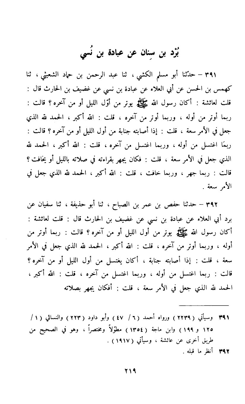 392 - حَدَّثَنَا حَفْصُ بْنُ عُمَرَ بْنِ الصَّبَّاحِ، ثنا أَبُو حُذَيْفَةَ، ثنا سُفْيَانُ، عَنْ بُرْدٍ أَبِي الْعَلَاءِ، عَنْ عُبَادَةَ بْنِ نُسَيٍّ، عَنْ غُضَيْفِ بْنِ الْحَارِثِ، قَالَ: قُلْتُ لِعَائِشَةَ: أَكَانَ رَسُولُ اللَّهِ صَلَّى اللهُ عَلَيْهِ وَسَلَّمَ يُوتِرُ مِنْ أَوَّلِ اللَّيْلِ أَوْ مِنْ آخِرِهِ؟ قَالَتْ: §«رُبَّمَا أَوْتَرَ مِنْ أَوَّلِهِ , وَرُبَّمَا أَوْتَرَ مِنْ آخِرِهِ» , قُلْتُ: اللَّهُ أَكْبَرُ الْحَمْدُ لِلَّهِ الَّذِي جَعَلَ فِي الْأَمْرِ سَعَةً , قُلْتُ: إِذَا أَصَابَتْهُ جَنَابَةٌ أَكَانَ يَغْتَسِلُ مِنْ أَوَّلِ اللَّيْلِ أَوْ مِنْ آخِرِهِ؟ قَالَتْ: «رُبَّمَا اغْتَسَلَ مِنْ أَوَّلِهِ , وَرُبَّمَا اغْتَسَلَ مِنْ آخِرِهِ» , قُلْتُ: اللَّهُ أَكْبَرُ الْحَمْدُ لِلَّهِ الَّذِي جَعَلَ فِي الْأَمْرِ سَعَةً , قُلْتُ: أَفَكَانَ يَجْهَرُ بِصَلَاتِهِ؟
