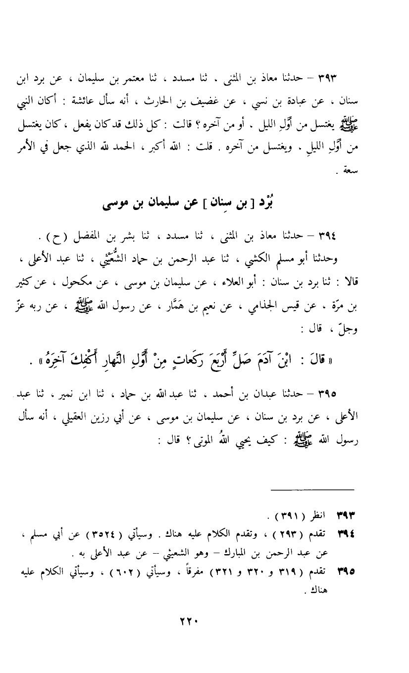 394 - حَدَّثَنَا مُعَاذُ بْنُ الْمُثَنَّى، ثنا مُسَدَّدٌ، ثنا بِشْرُ بْنُ الْمُفَضَّلِ، ح , وَحَدَّثَنَا أَبُو مُسْلِمٍ الْكَشِّيُّ، ثنا عَبْدُ الرَّحْمَنِ بْنُ حَمَّادٍ الشُّعَيْثِيُّ، ثنا عَبْدُ الْأَعْلَى، قَالَا: ثنا بُرْدُ بْنُ سِنَانٍ أَبُو الْعَلَاءِ، عَنْ سُلَيْمَانَ بْنِ مُوسَى، عَنْ مَكْحُولٍ، عَنْ كَثِيرِ بْنِ مُرَّةَ، عَنْ قَيْسٍ الْجُذَامِيِّ، عَنْ نُعَيْمِ بْنِ هَمَّارٍ، عَنْ رَسُولِ اللَّهِ صَلَّى اللهُ عَلَيْهِ وَسَلَّمَ عَنْ رَبِّهِ، عَزَّ وَجَلَّ قَالَ: " قَالَ: §«ابْنَ آدَمَ صَلِّ أَرْبَعَ رَكَعَاتٍ مِنْ أَوَّلِ النَّهَارِ أَكْفِكَ آخِرَهُ»