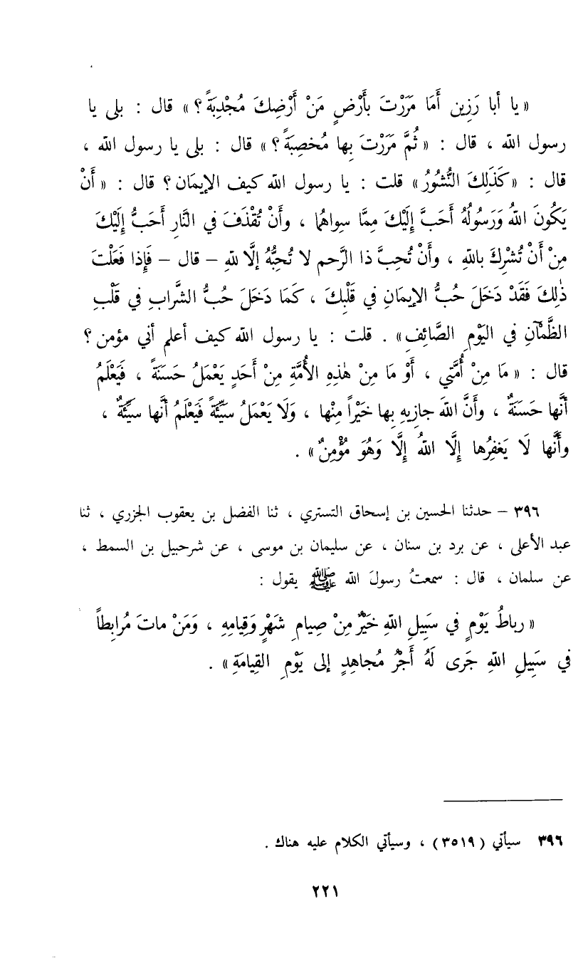 396 - حَدَّثَنَا الْحُسَيْنُ بْنُ إِسْحَاقَ التُّسْتَرِيُّ، ثنا الْفَضْلُ بْنُ يَعْقُوبَ الْجَزَرِيُّ، ثنا عَبْدُ الْأَعْلَى، عَنْ بُرْدِ بْنِ سِنَانٍ، عَنْ سُلَيْمَانَ بْنِ مُوسَى، عَنْ شُرَحْبِيلَ بْنِ السِّمْطِ، عَنْ سَلْمَانَ، قَالَ: سَمِعْتُ رَسُولَ اللَّهِ صَلَّى اللهُ عَلَيْهِ وَسَلَّمَ يَقُولُ: §«رِبَاطُ يَوْمٍ فِي سَبِيلِ اللَّهِ خَيْرٌ مِنْ صِيَامِ شَهْرٍ وَقِيَامِهِ وَمَنْ مَاتَ مُرَابِطًا فِي سَبِيلِ اللَّهِ جَرَى لَهُ أَجْرُ مُجَاهِدٍ إِلَى يَوْمِ الْقِيَامَةِ»