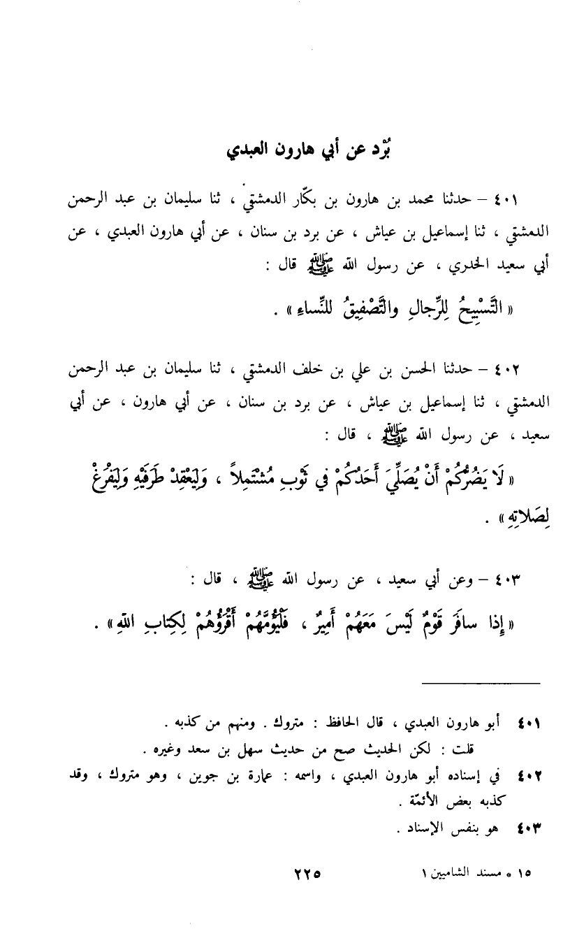 401 - حَدَّثَنَا مُحَمَّدُ بْنُ هَارُونَ بْنِ بَكَّارٍ الدِّمَشْقِيُّ، ثنا سُلَيْمَانُ بْنُ عَبْدِ الرَّحْمَنِ الدِّمَشْقِيُّ، ثنا إِسْمَاعِيلُ بْنُ عَيَّاشٍ، عَنْ بُرْدِ بْنِ سِنَانٍ، عَنْ أَبِي هَارُونَ الْعَبْدِيِّ، عَنْ أَبِي سَعِيدٍ الْخُدْرِيِّ، عَنْ رَسُولِ اللَّهِ صَلَّى اللهُ عَلَيْهِ وَسَلَّمَ قَالَ: §«التَّسْبِيحُ لِلرِّجَالِ وَالتَّصْفِيقُ لِلنِّسَاءِ»