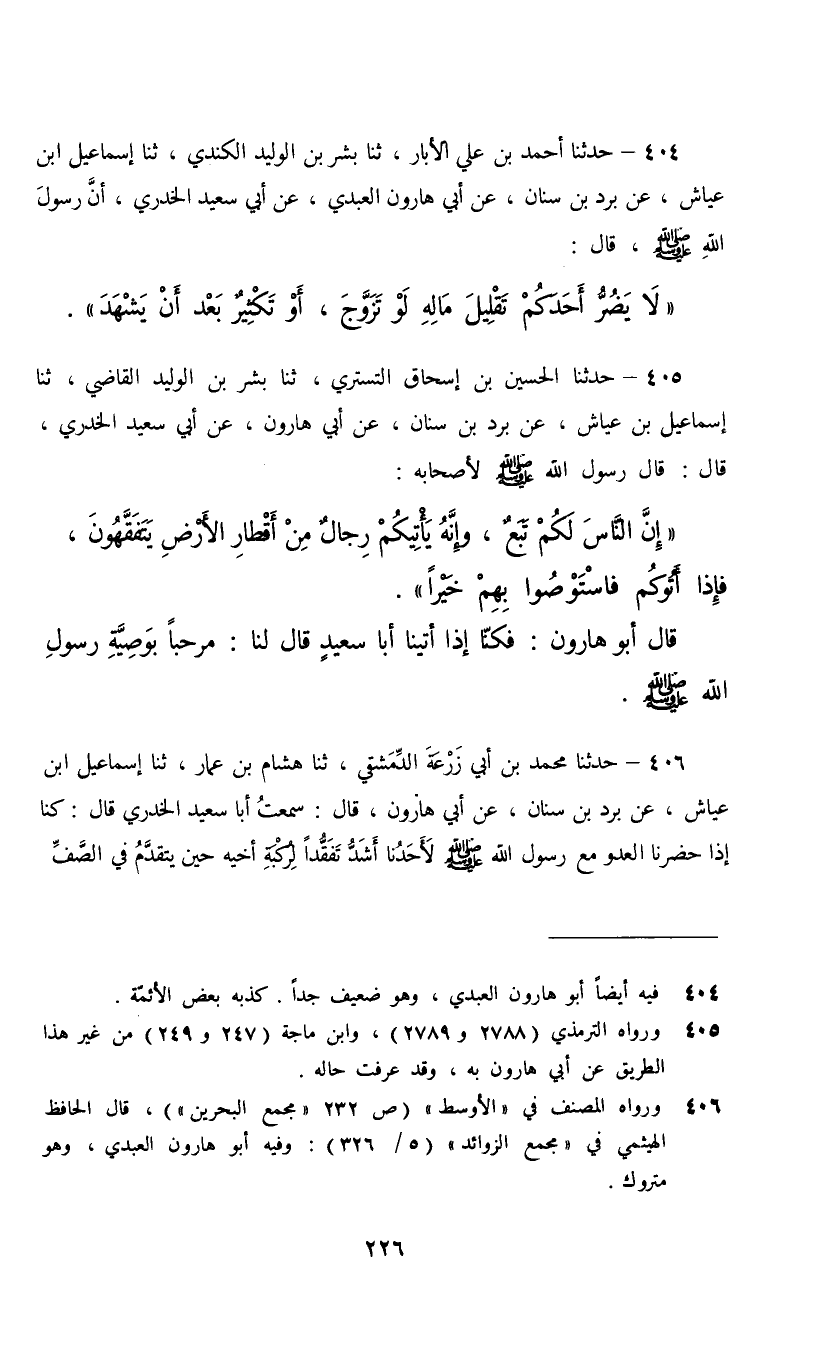 404 - حَدَّثَنَا أَحْمَدُ بْنُ عَلِيٍّ الْأَبَّارُ، ثنا بِشْرُ بْنُ الْوَلِيدِ الْكِنْدِيُّ، ثنا إِسْمَاعِيلُ بْنُ عَيَّاشٍ، عَنْ بُرْدِ بْنِ سِنَانٍ، عَنْ أَبِي هَارُونَ الْعَبْدِيِّ، عَنْ أَبِي سَعِيدٍ الْخُدْرِيِّ، أَنَّ رَسُولَ اللَّهِ صَلَّى اللهُ عَلَيْهِ وَسَلَّمَ قَالَ: §«لَا يَضُرُّ أَحَدَكُمْ تَقْلِيلُ مَالِهِ لَوْ تَزَوَّجَ , أَوْ تَكْثِيرٌ بَعْدَ أَنْ يَشْهَدَ»