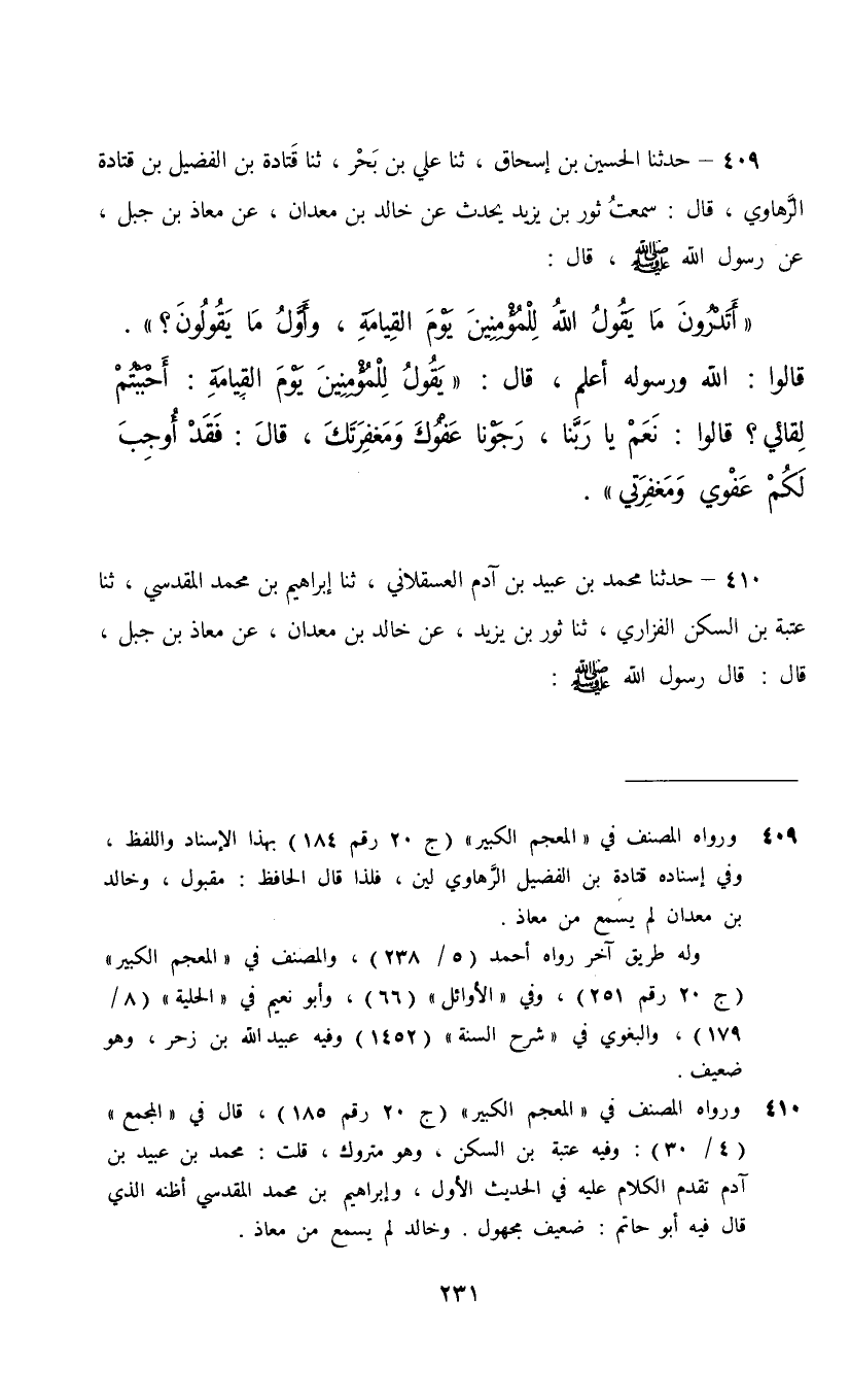 409 - حَدَّثَنَا الْحُسَيْنُ بْنُ إِسْحَاقَ، ثنا عَلِيُّ بْنُ بَحْرٍ، ثنا قَتَادَةُ بْنُ الْفُضَيْلِ بْنِ قَتَادَةَ الرَّهَاوِيُّ، قَالَ: سَمِعْتُ ثَوْرَ بْنَ يَزِيدَ، يُحَدِّثُ عَنْ خَالِدِ بْنِ مَعْدَانَ، عَنْ مُعَاذِ بْنِ جَبَلٍ، عَنْ رَسُولِ اللَّهِ صَلَّى اللهُ عَلَيْهِ وَسَلَّمَ قَالَ: «أَتَدْرُونَ مَا يَقُولُ اللَّهُ لِلْمُؤْمِنِينَ يَوْمَ الْقِيَامَةِ وَأَوَّلُ مَا يَقُولُونَ؟» قَالُوا: اللَّهُ وَرَسُولُهُ أَعْلَمُ , قَالَ: «يَقُولُ لِلْمُؤْمِنِينَ يَوْمَ الْقِيَامَةِ §أَحْبَبْتُمْ لِقَائِي؟» قَالُوا: نَعَمْ يَا رَبَّنَا رَجَوْنَا عَفْوَكَ وَمَغْفِرَتَكَ قَالَ: «فَقَدْ أُوجِبُ لَكُمْ عَفْوِي وَمَغْفَرَتِي»