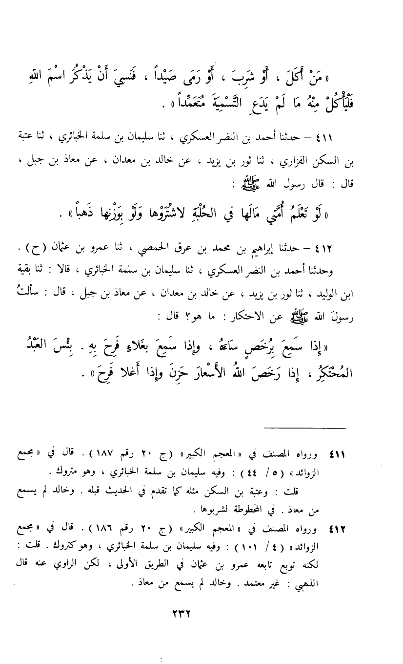 412 - حَدَّثَنَا إِبْرَاهِيمُ بْنُ مُحَمَّدِ بْنِ عِرْقٍ الْحِمْصِيُّ، ثنا عَمْرُو بْنُ عُثْمَانَ، ح , وَحَدَّثَنَا أَحْمَدُ بْنُ النَّضْرِ الْعَسْكَرِيُّ، ثنا سُلَيْمَانُ بْنُ سَلَمَةَ الْخَبَائِرِيُّ، قَالَا: ثنا بَقِيَّةُ بْنُ الْوَلِيدِ، ثنا ثَوْرُ بْنُ يَزِيدَ، عَنْ خَالِدِ بْنِ مَعْدَانَ، عَنْ مُعَاذِ بْنِ جَبَلٍ، قَالَ: سَأَلْتُ رَسُولَ اللَّهِ صَلَّى اللهُ عَلَيْهِ وَسَلَّمَ عَنِ الِاحْتِكَارِ مَا هُوَ؟ قَالَ: §«إِذَا سَمِعَ بِرُخْصٍ سَاءَهُ وَإِذَا سَمِعَ بِغَلَاءٍ فَرِحَ بِهِ بِئْسَ الْعَبْدُ الْمُحْتَكِرُ , إِذَا رَخَّصَ اللَّهُ الْأَسْعَارَ حَزِنَ وَإِذَا أَغْلَا فَرِحَ»
