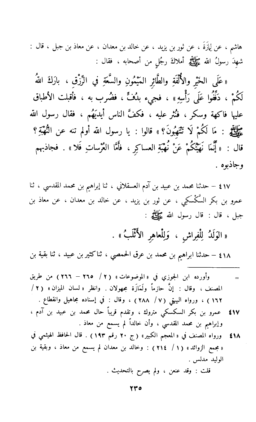 417 - حَدَّثَنَا مُحَمَّدُ بْنُ عُبَيْدِ بْنِ آدَمَ الْعَسْقَلَانِيُّ، ثنا إِبْرَاهِيمُ بْنُ مُحَمَّدٍ الْمَقْدِسِيُّ، ثنا عَمْرُو بْنُ بَكْرٍ السَّكْسَكِيُّ، عَنْ ثَوْرِ بْنِ يَزِيدَ، عَنْ خَالِدِ بْنِ مَعْدَانَ، عَنْ مُعَاذِ بْنِ جَبَلٍ، قَالَ: قَالَ رَسُولُ اللَّهِ صَلَّى اللهُ عَلَيْهِ وَسَلَّمَ: §«الْوَلَدُ لِلْفِرَاشِ وَلِلْعَاهِرِ الْأَثْلَبُ»