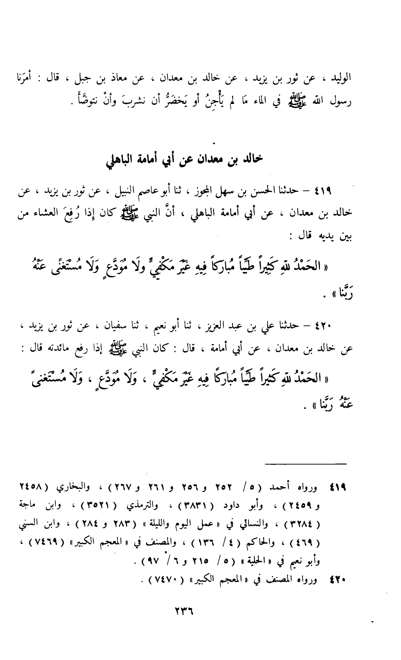419 - حَدَّثَنَا الْحَسَنُ بْنُ سَهْلٍ الْمُجَوِّزُ، ثنا أَبُو عَاصِمٍ النَّبِيلُ، عَنْ ثَوْرِ بْنِ يَزِيدَ، عَنْ خَالِدِ بْنِ مَعْدَانَ، عَنْ أَبِي أُمَامَةَ الْبَاهِلِيِّ، أَنَّ النَّبِيَّ صَلَّى اللهُ عَلَيْهِ وَسَلَّمَ كَانَ §إِذَا رُفِعَ الْعَشَاءُ مِنْ بَيْنِ يَدَيْهِ قَالَ: «الْحَمْدُ لِلَّهِ كَثِيرًا طَيِّبًا مُبَارَكًا فِيهِ غَيْرَ مَكْفِيٍّ وَلَا مُوَدَّعٍ وَلَا مُسْتَغْنًى عَنْهُ , رَبَّنَا»