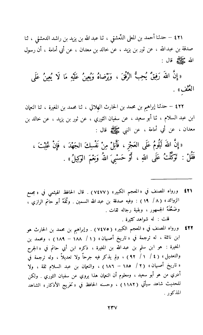 422 - حَدَّثَنَا إِبْرَاهِيمُ بْنُ مُحَمَّدِ بْنِ الْحَارِثِ الْهِلَالِيُّ، ثنا مُحَمَّدُ بْنُ الْمُغِيرَةِ، ثنا النُّعْمَانُ بْنُ عَبْدِ السَّلَامِ، ثنا أَبُو سَعِيدٍ، عَنْ سُفْيَانَ الثَّوْرِيِّ، عَنْ ثَوْرِ بْنِ يَزِيدَ، عَنْ خَالِدِ بْنِ مَعْدَانَ، عَنْ أَبِي أُمَامَةَ، عَنِ النَّبِيِّ صَلَّى اللهُ عَلَيْهِ وَسَلَّمَ قَالَ: §«إِنَّ اللَّهَ لَيَلُومُ عَلَى الْعَجْزِ , فَأَنِلْ مِنْ نَفْسِكَ الْجَهْدَ فَإِنْ غُلِبْتَ فَقُلْ تَوَكَّلْتُ عَلَى اللَّهِ أَوْ حَسْبِيَ اللَّهُ وَنِعْمَ الْوَكِيلُ»