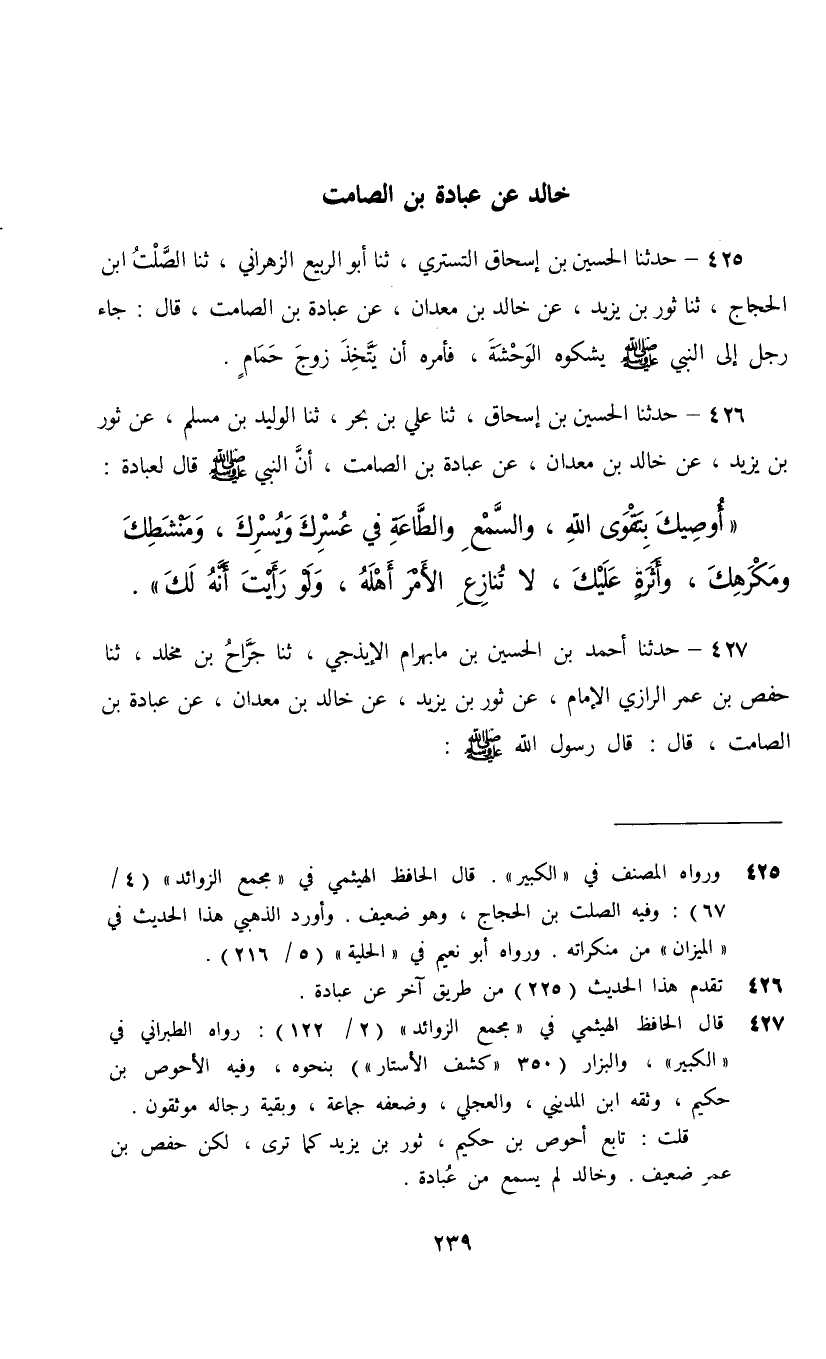 426 - حَدَّثَنَا الْحُسَيْنُ بْنُ إِسْحَاقَ، ثنا عَلِيُّ بْنُ بَحْرٍ، ثنا الْوَلِيدُ بْنُ مُسْلِمٍ، عَنْ ثَوْرِ بْنِ يَزِيدَ، عَنْ خَالِدِ بْنِ مَعْدَانَ، عَنْ عُبَادَةَ بْنِ الصَّامِتِ، أَنَّ النَّبِيَّ صَلَّى اللهُ عَلَيْهِ وَسَلَّمَ قَالَ لِعُبَادَةَ: §«أُوصِيكَ بِتَقْوَى اللَّهِ وَالسَّمْعِ وَالطَّاعَةِ فِي عُسْرِكَ وَيُسْرِكَ وَمَنْشَطِكَ وَمَكْرَهِكَ وَأَثَرَةٍ عَلَيْكَ لَا تُنَازِعِ الْأَمْرَ أَهْلَهُ وَلَوْ رَأَيْتَ أَنَّهُ لَكَ»