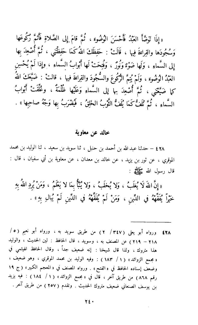 428 - حَدَّثَنَا عَبْدُ اللَّهِ بْنُ أَحْمَدَ بْنِ حَنْبَلٍ، ثنا سُوَيْدُ بْنُ سَعِيدٍ، ثنا الْوَلِيدُ بْنُ مُحَمَّدٍ الْمُوَقَّرِيُّ، عَنْ ثَوْرِ بْنِ يَزِيدَ، عَنْ خَالِدِ بْنِ مَعْدَانَ، عَنْ مُعَاوِيَةَ بْنِ أَبِي سُفْيَانَ، قَالَ: قَالَ رَسُولُ اللَّهِ صَلَّى اللهُ عَلَيْهِ وَسَلَّمَ: «إِنَّ §اللَّهَ لَا يُغْلَبُ وَلَا يُخْلَبُ وَلَا يُنَبَّأُ بِمَا لَا يَعْلَمُ وَمَنْ يُرِدِ اللَّهُ بِهِ خَيْرًا يُفَقِّهْهُ فِي الدِّينِ وَمَنْ لَمْ يُفَقِّهْهُ فِي الدِّينِ لَمْ يُبَالِ بِهِ»