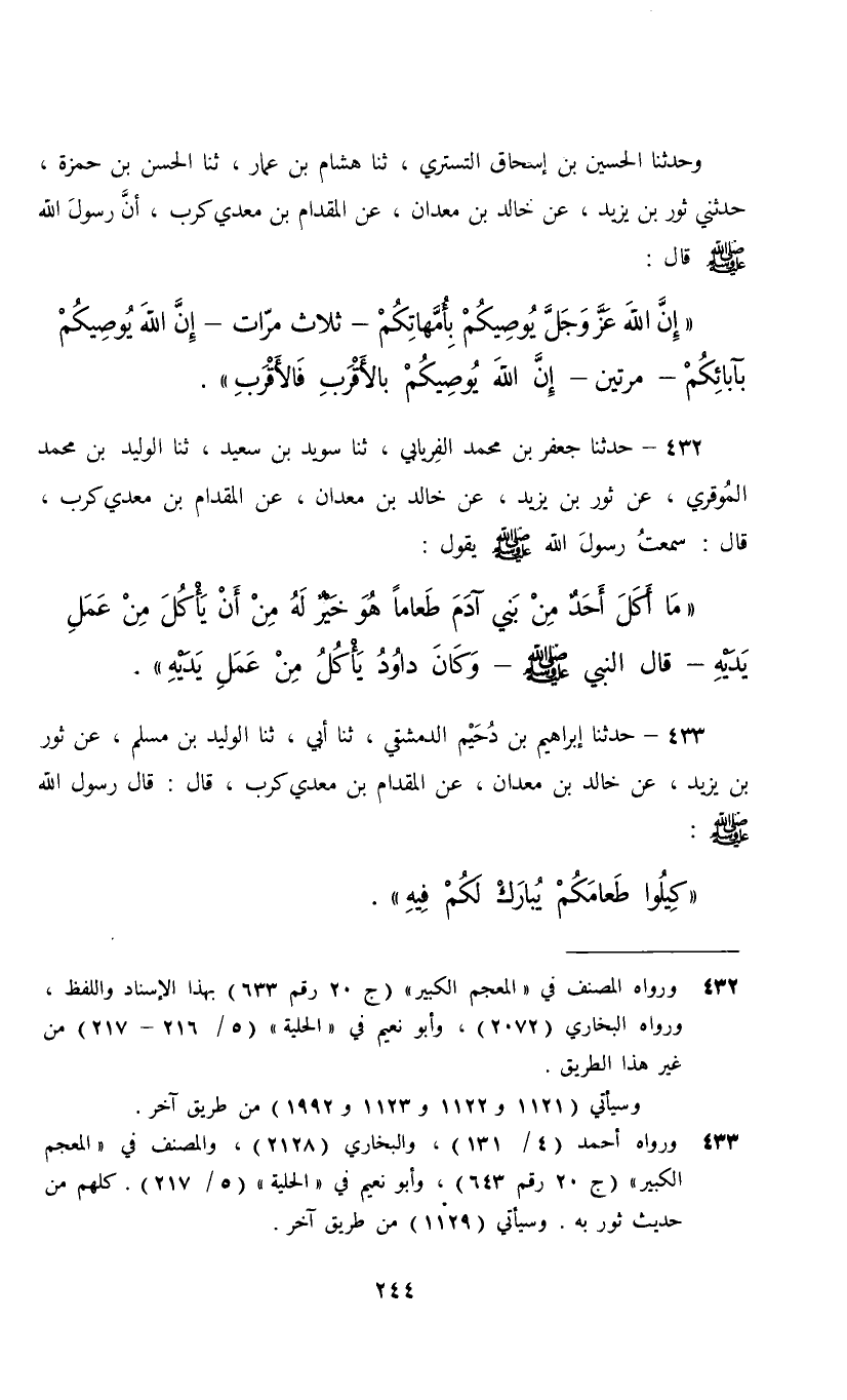 432 - حَدَّثَنَا جَعْفَرُ بْنُ مُحَمَّدٍ الْفِرْيَابِيُّ، ثنا سُوَيْدُ بْنُ سَعِيدٍ، ثنا الْوَلِيدُ بْنُ مُحَمَّدٍ الْمُوَقَّرِيُّ، عَنْ ثَوْرِ بْنِ يَزِيدَ، عَنْ خَالِدِ بْنِ مَعْدَانَ، عَنِ الْمِقْدَامِ بْنِ مَعْدِي كَرِبَ، قَالَ: سَمِعْتُ رَسُولَ اللَّهِ صَلَّى اللهُ عَلَيْهِ وَسَلَّمَ يَقُولُ: §" مَا أَكَلَ أَحَدٌ مِنْ بَنِي آدَمَ طَعَامًا هُوَ خَيْرٌ لَهُ مِنْ أَنْ يَأْكُلَ مِنْ عَمَلِ يَدَيْهِ، قَالَ النَّبِيُّ صَلَّى اللهُ عَلَيْهِ وَسَلَّمَ: «وَكَانَ دَاوُدُ يَأْكُلُ مِنْ عَمَلِ يَدَيْهِ»