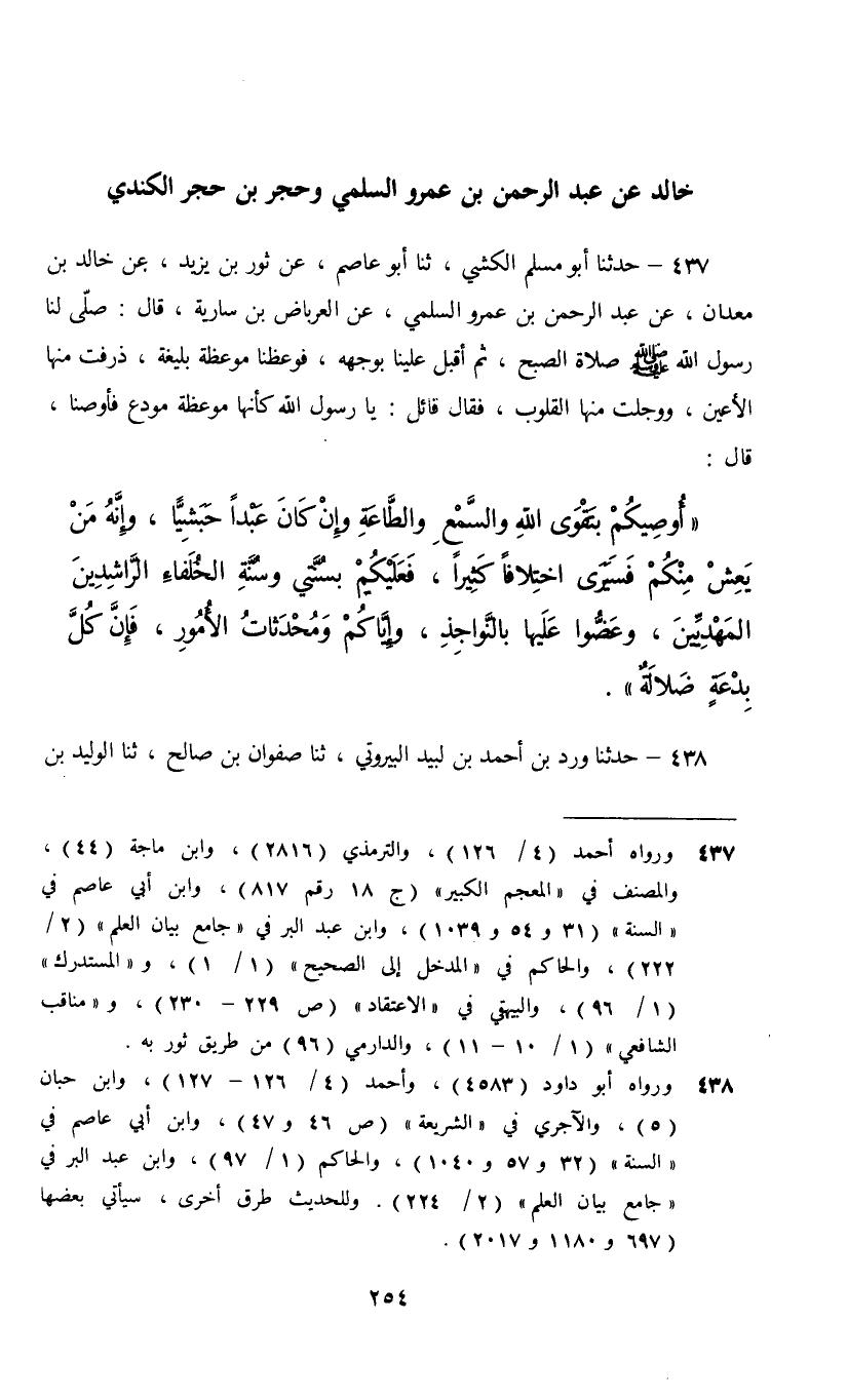 437 - حَدَّثَنَا أَبُو مُسْلِمٍ الْكَشِّيُّ، ثنا أَبُو عَاصِمٍ، عَنْ ثَوْرِ بْنِ يَزِيدَ، عَنْ خَالِدِ بْنِ مَعْدَانَ، عَنْ عَبْدِ الرَّحْمَنِ بْنِ عَمْرٍو السُّلَمِيِّ، عَنِ الْعِرْبَاضِ بْنِ سَارِيَةَ، قَالَ: صَلَّى لَنَا رَسُولُ اللَّهِ صَلَّى اللهُ عَلَيْهِ وَسَلَّمَ صَلَاةَ الصُّبْحِ , ثُمَّ أَقْبَلَ عَلَيْنَا بِوَجْهِهِ فَوَعَظَنَا مَوْعِظَةً بَلِيغَةً ذَرَفَتْ مِنْهَا الْأَعْيُنُ , وَوَجِلَتْ مِنْهَا الْقُلُوبُ , فَقَالَ قَائِلٌ: يَا رَسُولَ اللَّهِ كَأَنَّهَا مَوْعِظَةُ مُوَدَّعٍ فَأَوْصِنَا قَالَ: §«أُوصِيكُمْ بِتَقْوَى اللَّهِ وَالسَّمْعِ وَالطَّاعَةِ وَإِنْ كَانَ عَبْدًا حَبَشِيًّا , وَإِنَّهُ مَنْ يَعِشْ مِنْكُمْ فَسَيَرَ اخْتِلَافًا كَثِيرًا فَعَلَيْكُمْ بِسُنَّتِي وَسُنَّةِ الْخُلَفَاءِ الرَّاشِدِينَ الْمَهْدِيِّينَ , وَعَضُّوا عَلَيْهَا بِالنَّوَاجِذِ , وَإِيَّاكُمْ وَمُحْدَثَاتِ الْأُمُورِ فَإِنَّ كُلَّ بِدْعَةٍ ضَلَالَةٌ»