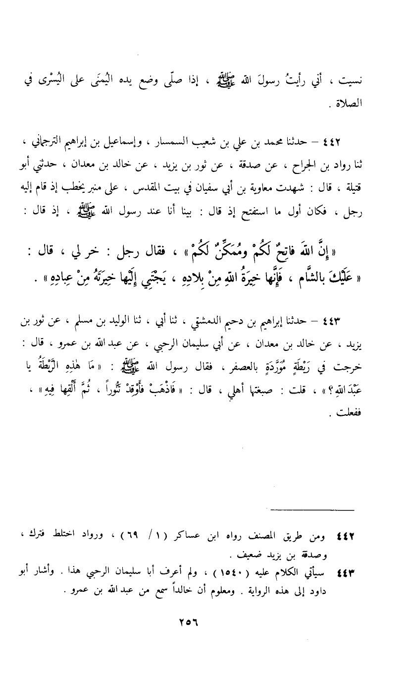 442 - حَدَّثَنَا مُحَمَّدُ بْنُ عَلِيِّ بْنِ شُعَيْبٍ السِّمْسَارُ، وَإِسْمَاعِيلُ بْنُ إِبْرَاهِيمَ التَّرْجُمَانِيُّ، ثنا رَوَّادُ بْنُ الْجَرَّاحِ، عَنْ صَدَقَةَ، عَنْ ثَوْرِ بْنِ يَزِيدَ، عَنْ خَالِدِ بْنِ مَعْدَانَ، حَدَّثَنِي أَبُو قُتَيْلَةَ، قَالَ: شَهِدْتُ مُعَاوِيَةَ بْنَ أَبِي سُفْيَانَ فِي بَيْتِ الْمَقْدِسِ عَلَى مِنْبَرٍ يَخْطُبُ إِذْ قَامَ إِلَيْهِ رَجُلٌ فَكَانَ أَوَّلُ مَا اسْتَفْتَحَ إِذْ قَالَ: بَيْنَا أَنَا عِنْدَ رَسُولِ اللَّهِ صَلَّى اللهُ عَلَيْهِ وَسَلَّمَ: إِذْ قَالَ: «إِنَّ اللَّهَ فَاتِحٌ لَكُمْ وَمُمَكِّنٌ لَكُمْ» فَقَالَ رَجُلٌ: خِرْ لِي قَالَ: §«عَلَيْكَ بِالشَّامِ فَإِنَّهَا خِيرَةُ اللَّهِ مِنْ بِلَادِهِ يَجْتَبِي إِلَيْهَا خِيرَتَهُ مِنْ عِبَادِهِ»