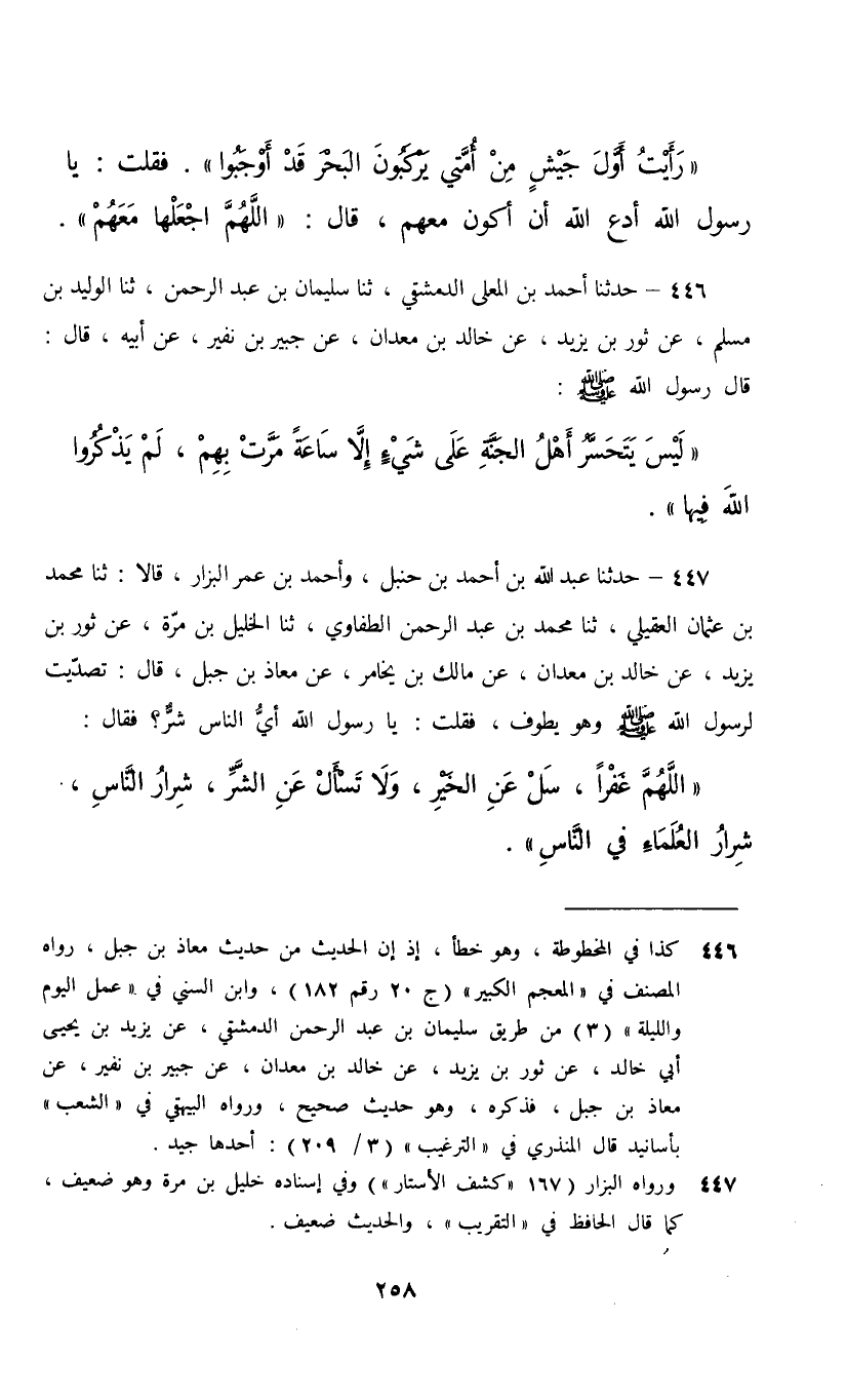 447 - حَدَّثَنَا عَبْدُ اللَّهِ بْنُ أَحْمَدَ بْنِ حَنْبَلٍ، وَأَحْمَدُ بْنُ عُمَرَ الْبَزَّارُ , قَالَا: ثنا مُحَمَّدُ بْنُ عُثْمَانَ الْعُقَيْلِيُّ، ثنا مُحَمَّدُ بْنُ عَبْدِ الرَّحْمَنِ الطُّفَاوِيُّ، ثنا الْخَلِيلُ بْنُ مُرَّةَ، عَنْ ثَوْرِ بْنِ يَزِيدَ، عَنْ خَالِدِ بْنِ مَعْدَانَ، عَنْ مَالِكِ بْنِ يُخَامِرَ، عَنْ مُعَاذِ بْنِ جَبَلٍ، قَالَ: تَصَدَّيْتُ لِرَسُولِ اللَّهِ صَلَّى اللهُ عَلَيْهِ وَسَلَّمَ وَهُوَ يَطُوفُ فَقُلْتُ: يَا رَسُولَ اللَّهِ أَيُّ النَّاسِ شَرٌّ فَقَالَ: «اللَّهُمَّ غَفْرًا , §سَلْ عَنِ الْخَيْرِ وَلَا تَسْأَلْ عَنِ الشَّرِّ , شِرَارُ النَّاسِ شِرَارُ الْعُلَمَاءِ فِي النَّاسِ»