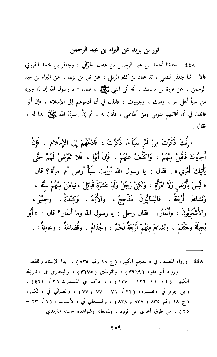 448 - حَدَّثَنَا أَحْمَدُ بْنُ عَبْدِ الرَّحْمَنِ بْنِ عِقَالٍ الْحَرَّانِيُّ، وَجَعْفَرُ بْنُ مُحَمَّدٍ الْفِرْيَابِيُّ قَالَا: ثنا جَعْفَرُ النُّفَيْلِيُّ، ثنا عَبَّادُ بْنُ كَثِيرٍ الرَّمْلِيُّ، عَنْ ثَوْرِ بْنِ يَزِيدَ، عَنِ الْبَرَاءِ بْنِ عَبْدِ الرَّحْمَنِ، عَنْ فَرْوَةَ بْنِ مُسَيْكٍ، أَنَّهُ أَتَى النَّبِيَّ صَلَّى اللهُ عَلَيْهِ وَسَلَّمَ فَقَالَ: يَا رَسُولَ اللَّهِ إِنَّ لَنَا جِيرَةً مِنْ سَبَأٍ، أَهْلُ عِزٍّ وَمُلْكٍ وَجَبَرُوتٍ فَائْذَنْ لِي أَنْ أَدْعُوَهُمْ إِلَى الْإِسْلَامِ , فَإِنَّ أَبَوْا فَائْذَنْ لِي أَنْ أُقَاتِلَهُمُ بِقَوْمِي وَمَنْ أَطَاعَنِي , فَأْذَنْ لَهُ ثُمَّ إِنَّ رَسُولَ اللَّهِ صَلَّى اللهُ عَلَيْهِ وَسَلَّمَ بَدَا لَهُ فَقَالَ: §«إِنَّكَ ذَكَرْتَ مِنْ أَمْرِ سَبَأٍ مَا ذَكَرْتَ فَادْعُهُمْ إِلَى الْإِسْلَامِ فَإِنْ أَجَابُوكَ فَاقْبَلْ مِنْهُمْ وَاكْفُفْ عَنْهُمْ , فَإِنْ أَبَوْا فَلَا تَعَرَّضْ لَهُمْ حَتَّى يَأْتِيَكَ أَمْرِي» فَقَالَ: يَا رَسُولَ اللَّهِ أَرَأَيْتَ سَبَأً , أَرْضٌ أَمِ امْرَأَةٌ؟ قَالَ: " لَيْسَ بِأَرْضٍ وَلَا امْرَأَةٍ، وَلَكِنْ رَجُلٌ وَلَدَ عَشْرَةَ قَبَائِلَ تَيَامَنَ مِنْهُمْ سِتَّةٌ، وَتَشَاءَمَ أَرْبَعَةٌ، فَالْيَمَانِيُونَ مَذْحِجٌ، وَالْأَزْدُ، وَكِنْدَةُ، وَحِمْيَرٌ، وَالْأَشْعَرِيُّونَ، وَأنْمَارٌ، فَقَالَ رَجُلٌ: يَا رَسُولَ اللَّهِ وَمَا أَنْمَارُ؟ قَالَ: «أَبُو بُجِيلَةَ، وَخَثْعَمٌ، وَتَشَاءَمَ مِنْهُمْ أَرْبَعَةٌ، لَحْمٌ، وَجُذَامٌ، وَقُضَاعَةُ، وَعَامِلَةُ»