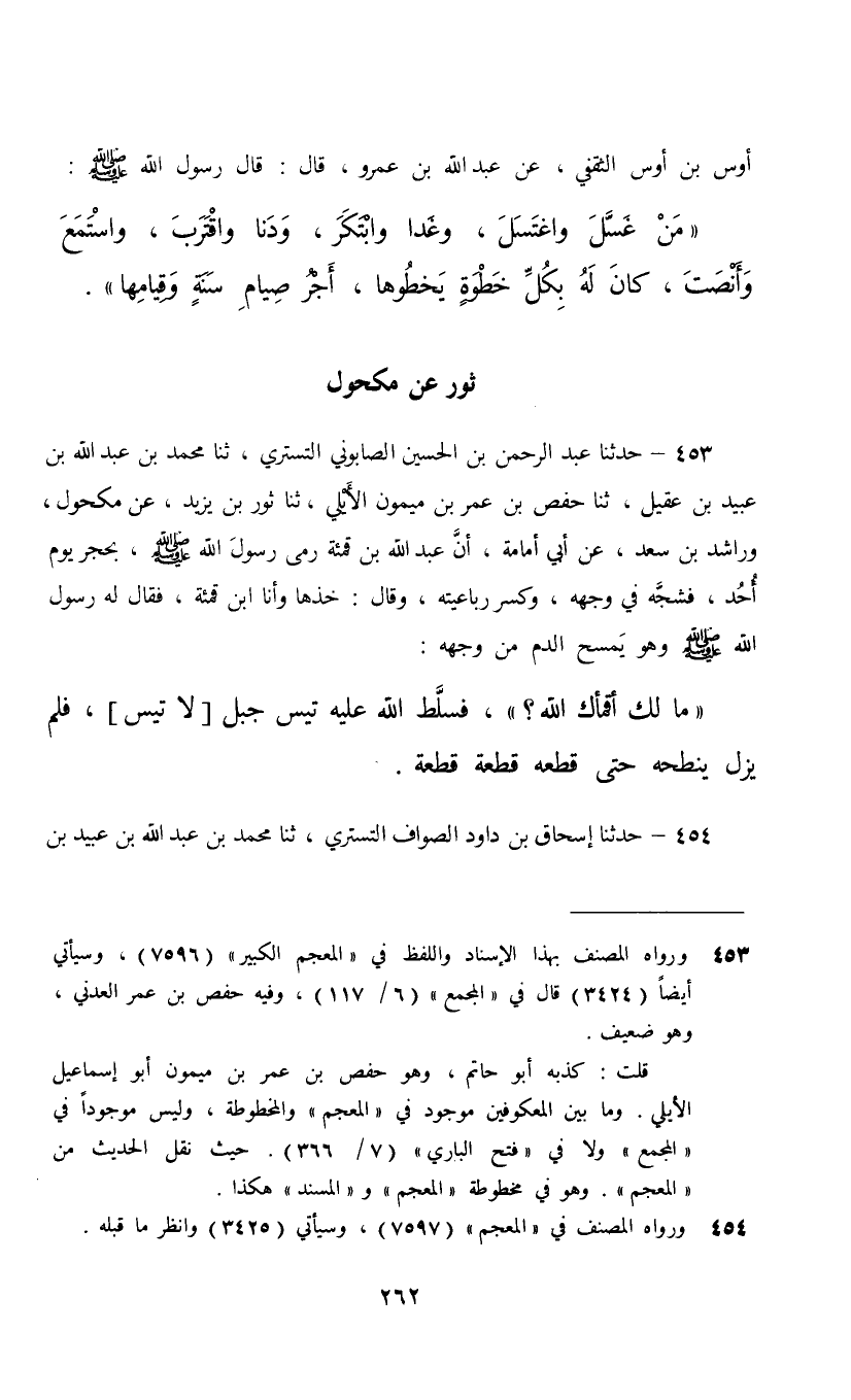 453 - حَدَّثَنَا عَبْدُ الرَّحْمَنِ بْنُ الْحُسَيْنِ الصَّابُونِيُّ التُّسْتَرِيُّ، ثنا مُحَمَّدُ بْنُ عَبْدِ اللَّهِ بْنِ عُبَيْدِ بْنِ عَقِيلٍ، ثنا حَفْصُ بْنُ عُمَرَ بْنِ مَيْمُونٍ الْأَيْلِيُّ، ثنا ثَوْرُ بْنُ يَزِيدَ، عَنْ مَكْحُولٍ، وَرَاشِدِ بْنِ سَعْدٍ، عَنْ أَبِي أُمَامَةَ، أَنَّ عَبْدَ اللَّهِ بْنَ قَمِئَةَ، رَمَى رَسُولَ اللَّهِ صَلَّى اللهُ عَلَيْهِ وَسَلَّمَ بِحَجَرٍ يَوْمَ أُحُدٍ فَشَجَّهُ فِي وَجْهِهِ، وَكَسَرَ رَبَاعِيَتَهُ وَقَالَ: خُذْهَا وَأَنَا ابْنُ قَمِئَةُ , فَقَالَ لَهُ رَسُولُ اللَّهِ صَلَّى اللهُ عَلَيْهِ وَسَلَّمَ - وَهُوَ يَمْسَحُ الدَّمَ مِنْ وَجْهِهِ: §«مَا لَكَ؟ أَقْمَأَكَ اللَّهُ» . فَسَلَّطَ اللَّهُ عَلَيْهِ تَيْسَ جَبَلٍ فَلَمْ يَزَلْ يَنْطِحُهُ حَتَّى قَطَّعَهُ قِطْعَةً قِطْعَةً