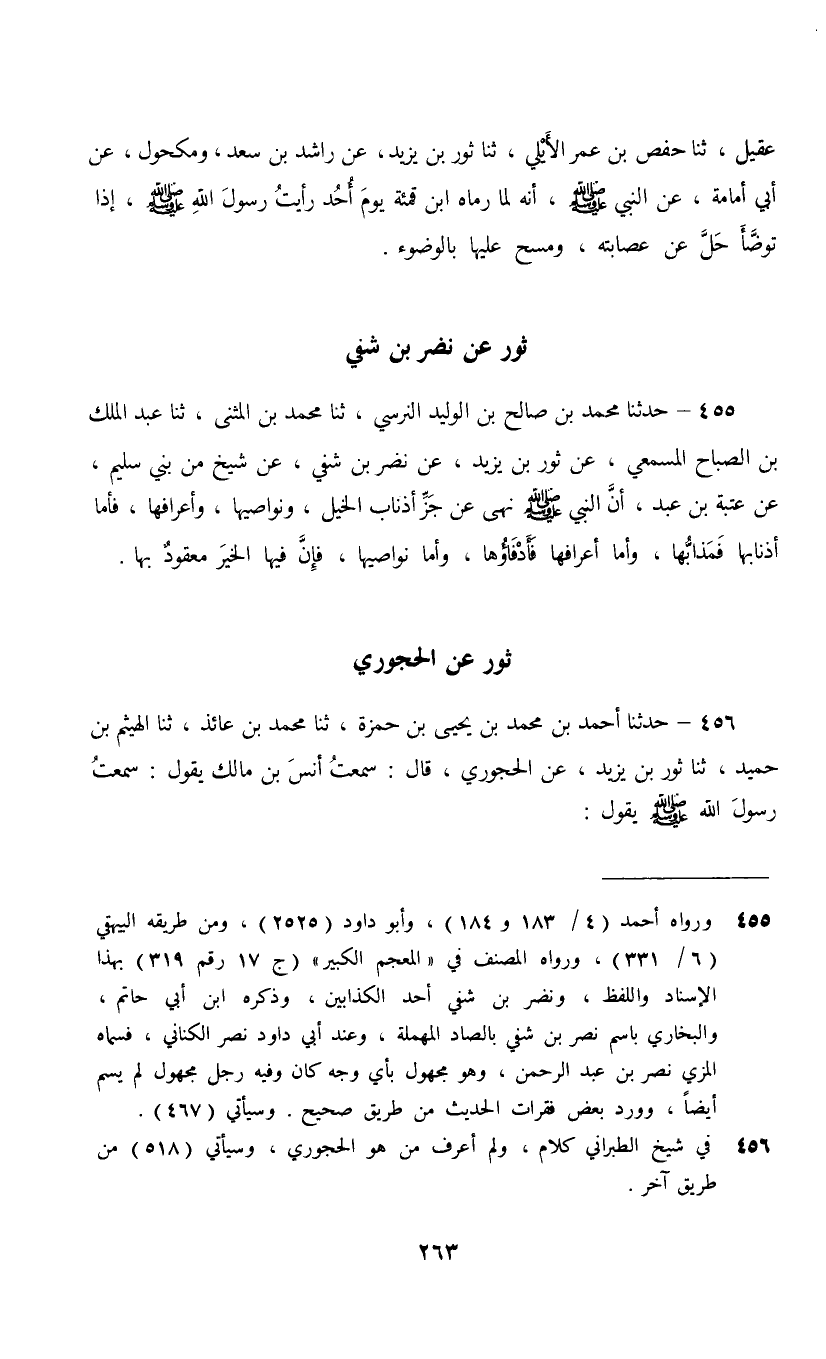 455 - حَدَّثَنَا مُحَمَّدُ بْنُ صَالِحِ بْنِ الْوَلِيدِ النَّرْسِيُّ، ثنا مُحَمَّدُ بْنُ الْمُثَنَّى، ثنا عَبْدُ الْمَلِكِ بْنُ الصَّبَّاحِ الْمِسْمَعِيُّ، عَنْ ثَوْرِ بْنِ يَزِيدَ، عَنْ نَضْرِ بْنِ شُفَيٍّ، عَنْ شَيْخٍ، مِنْ بَنِي سُلَيْمٍ , عَنْ عُتْبَةَ بْنِ عَبْدٍ أَنَّ النَّبِيَّ صَلَّى اللهُ عَلَيْهِ وَسَلَّمَ §«نَهَى عَنْ جَزِّ أَذْنَابِ الْخَيْلِ وَنَوَاصِيهَا وَأَعْرَافِهَا , فَأَمَّا أَذْنَابُهَا فَمَذَابُّهَا وَأَمَّا أَعْرَافُهَا فَأَدْفَاؤُهَا , وَأَمَّا نَوَاصِيهَا فَإِنَّ فِيهَا الْخَيْرَ مَعْقُودٌ بِهَا»