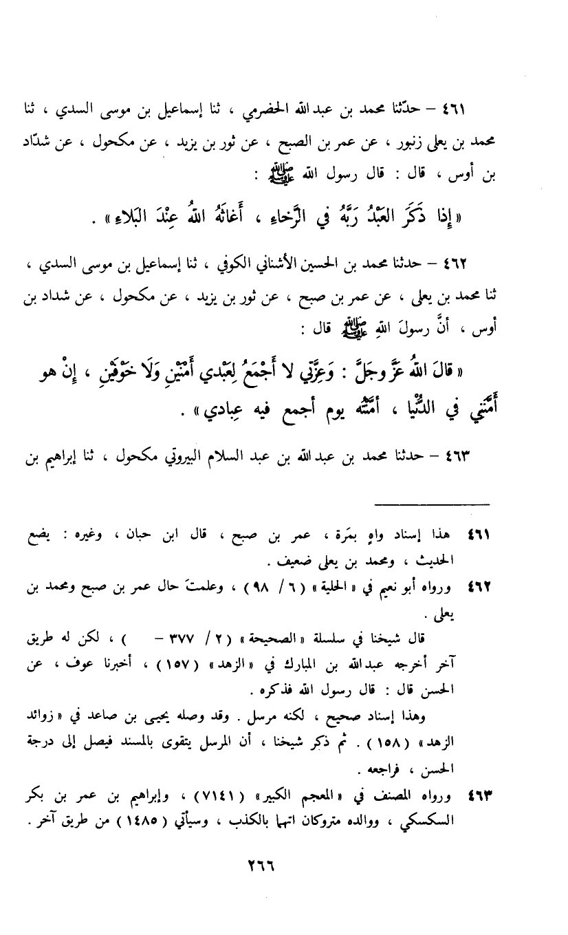 462 - حَدَّثَنَا مُحَمَّدُ بْنُ الْحُسَيْنِ الْأُشْنَانِيُّ الْكُوفِيُّ، ثنا إِسْمَاعِيلُ بْنُ مُوسَى السُّدِّيُّ، ثنا مُحَمَّدُ بْنُ يَعْلَى، عَنْ عُمَرَ بْنِ صُبْحٍ، عَنْ ثَوْرِ بْنِ يَزِيدَ، عَنْ مَكْحُولٍ، عَنْ شَدَّادِ بْنِ أَوْسٍ، أَنَّ رَسُولَ اللَّهِ صَلَّى اللهُ عَلَيْهِ وَسَلَّمَ قَالَ: قَالَ اللَّهُ عَزَّ وَجَلَّ: «§وَعِزَّتِي لَا أَجْمَعُ لِعَبْدِي أَمْنَيْنِ وَلَا خَوْفَيْنِ، إِنْ هُوَ أَمِنَنِي فِي الدُّنْيَا أَخَفْتُهُ يَوْمَ أَجْمَعُ عِبَادِي، وَإِنْ هُوَ خَافَنِي فِي الدُّنْيَا أَمَّنْتُهُ يَوْمَ أَجْمَعُ فِيهِ عِبَادِي»