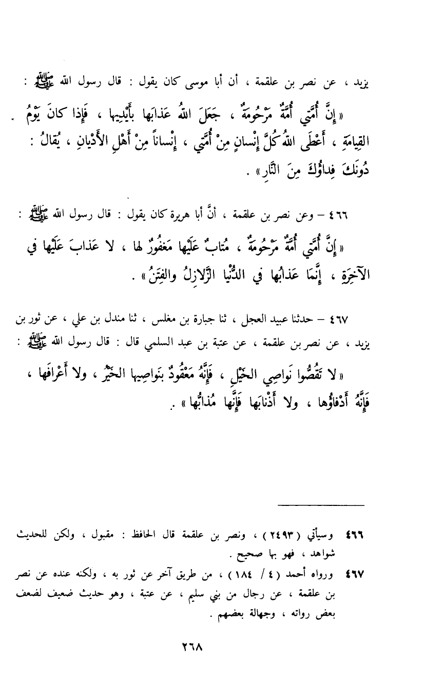 466 - وَعَنْ نَصْرِ بْنِ عَلْقَمَةَ، أَنَّ أَبَا هُرَيْرَةَ، كَانَ يَقُولُ: قَالَ رَسُولُ اللَّهِ صَلَّى اللهُ عَلَيْهِ وَسَلَّمَ: «إِنَّ §أُمَّتِي أُمَّةً مَرْحُومَةً , مُتَابٌ عَلَيْهَا، مَغْفُورٌ لَهَا , لَا عَذَابَ عَلَيْهَا فِي الْآخِرَةِ إِنَّمَا عَذَابُهَا فِي الدُّنْيَا الزَّلَازِلُ وَالْفِتَنُ»