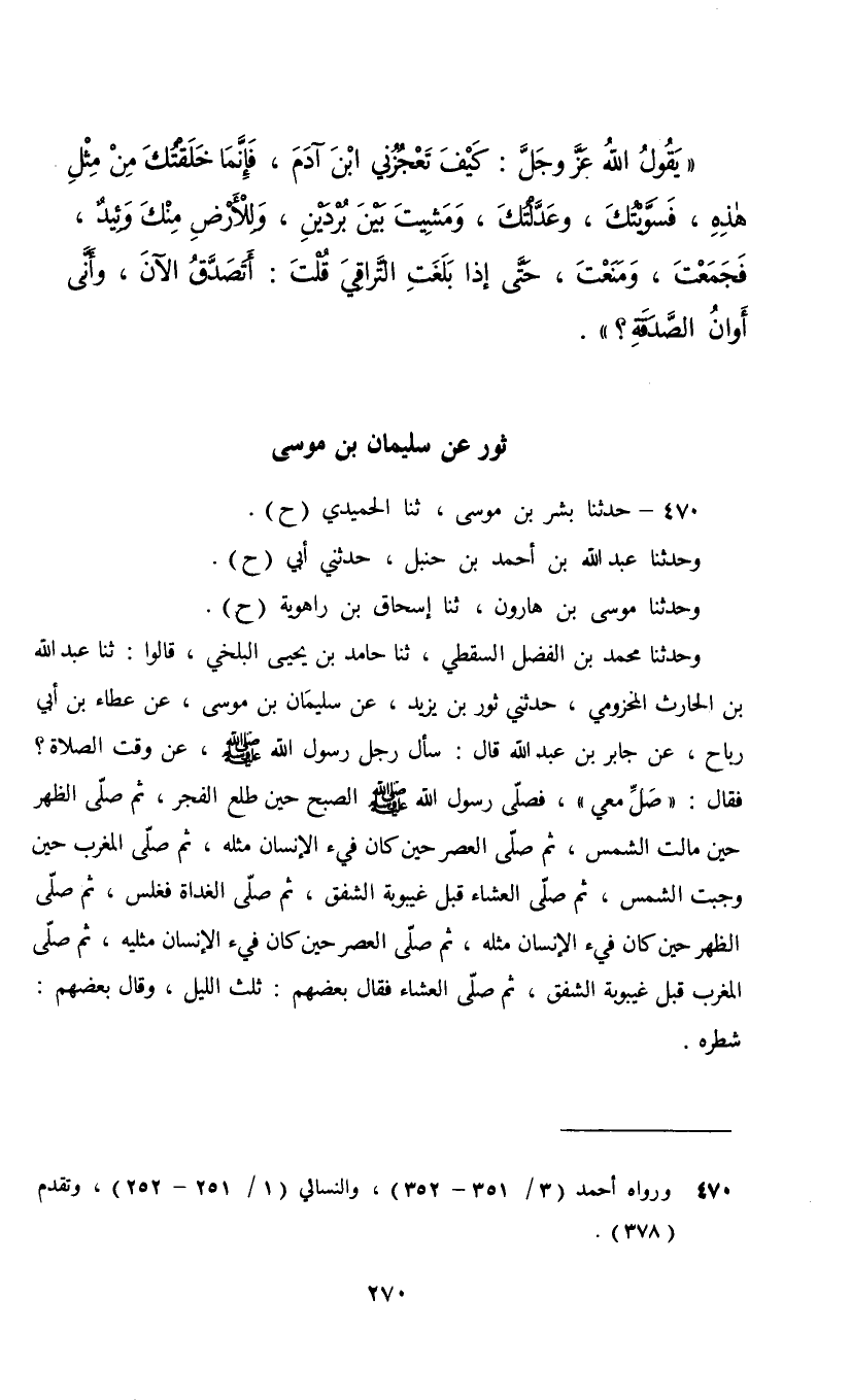 470 - حَدَّثَنَا بِشْرُ بْنُ مُوسَى، ثنا الْحُمَيْدِيُّ، ح , وَحَدَّثَنَا عَبْدُ اللَّهِ بْنُ أَحْمَدَ بْنِ حَنْبَلٍ، حَدَّثَنِي أَبِي ح، وَحَدَّثَنَا مُوسَى بْنُ هَارُونَ، ثنا إِسْحَاقُ بْنُ رَاهَوَيْهِ، ح , وَحَدَّثَنَا مُحَمَّدُ بْنُ الْفَضْلِ السَّقَطِيُّ، ثنا حَامِدُ بْنُ يَحْيَى الْبَلْخِيُّ، قَالُوا: ثنا عَبْدُ اللَّهِ بْنُ الْحَارِثِ الْمَخْزُومِيُّ، حَدَّثَنِي ثَوْرُ بْنُ يَزِيدَ، عَنْ سُلَيْمَانَ بْنِ مُوسَى، عَنْ عَطَاءِ بْنِ أَبِي رَبَاحٍ، عَنْ جَابِرِ بْنِ عَبْدِ اللَّهِ، قَالَ: سَأَلَ رَسُولَ اللَّهِ صَلَّى اللهُ عَلَيْهِ وَسَلَّمَ عَنْ وَقْتِ الصَّلَاةِ فَقَالَ: «صَلِّ مَعِي» §فَصَلَّى رَسُولُ اللَّهِ صَلَّى اللهُ عَلَيْهِ وَسَلَّمَ الصُّبْحَ حِينَ طَلَعَ الْفَجْرُ , ثُمَّ صَلَّى الظُّهْرَ حِينَ مَالَتِ الشَّمْسُ , ثُمَّ صَلَّى الْعَصْرَ حِينَ كَانَ فَيْءُ الْإِنْسَانِ مِثْلَهُ , ثُمَّ صَلَّى الْمَغْرِبَ حِينَ وَجَبَتِ الشَّمْسُ , ثُمَّ صَلَّى الْعِشَاءَ قَبْلَ غَيْبُوبَةِ الشَّفَقِ , ثُمَّ صَلَّى الْغَدَاةَ فَغَلَّسَ , ثُمَّ صَلَّى الظُّهْرَ حِينَ كَانَ فَيْءُ الْإِنْسَانِ مِثْلَهُ , ثُمَّ صَلَّى الْعَصْرَ حِينَ كَانَ فَيْءُ الْإِنْسَانِ مِثْلَيْهِ , ثُمَّ صَلَّى الْمَغْرِبَ قَبْلَ غَيْبُوبَةِ الشَّفَقِ , ثُمَّ صَلَّى الْعِشَاءَ، فَقَالَ بَعْضُهُمْ: ثُلُثُ اللَّيْلِ وَقَالَ بَعْضُهُمْ: شَطْرُهُ "