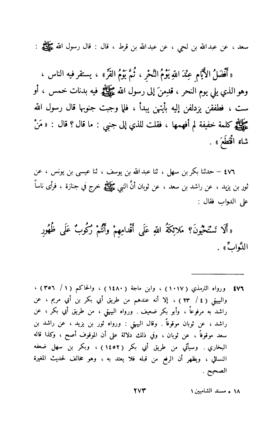 476 - حَدَّثَنَا بَكْرُ بْنُ سَهْلٍ، ثنا عَبْدُ اللَّهِ بْنُ يُوسُفَ، ثنا عِيسَى بْنُ يُونُسَ، عَنْ ثَوْرِ بْنِ يَزِيدَ، عَنْ رَاشِدِ بْنِ سَعْدٍ، عَنْ ثَوْبَانَ، أَنَّ النَّبِيَّ صَلَّى اللهُ عَلَيْهِ وَسَلَّمَ §خَرَجَ فِي جَنَازَةٍ فَرَأَى نَاسًا عَلَى الدَّوَابِّ فَقَالَ أَلَا تَسْتَحْيُونَ؟ مَلَائِكَةُ اللَّهِ عَلَى أَقْدَامِهِمْ وَأَنْتُمْ رُكُوبٌ عَلَى ظُهُوَرِ الدَّوَابِّ "