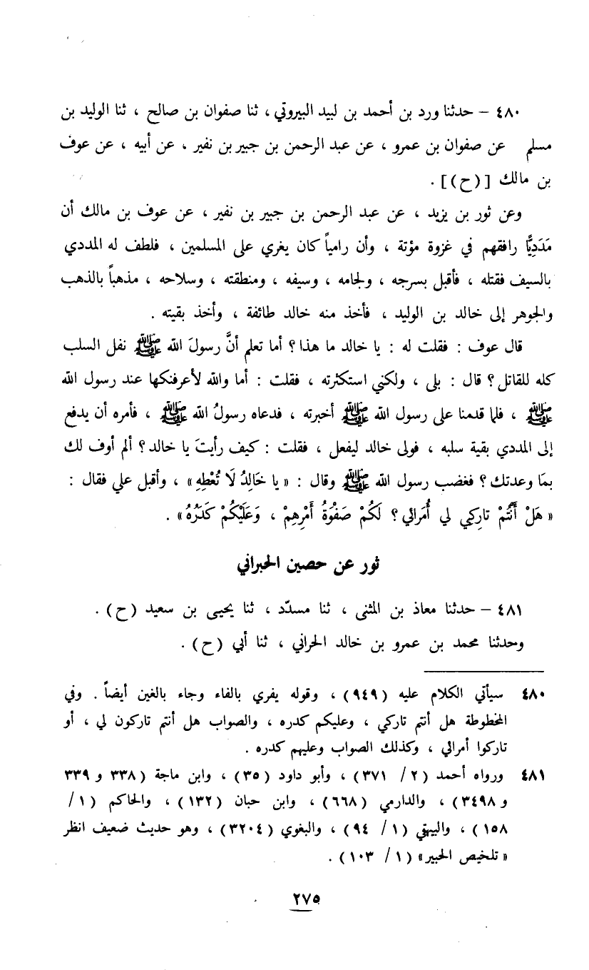 480 - حَدَّثَنَا وَرَدُ بْنُ أَحْمَدَ بْنِ لَبِيدٍ الْبَيْرُوتِيُّ، ثنا صَفْوَانُ بْنُ صَالِحٍ، ثنا الْوَلِيدُ بْنُ مُسْلِمٍ، عَنْ صَفْوَانَ بْنِ عَمْرٍو، عَنْ عَبْدِ الرَّحْمَنِ بْنِ جُبَيْرِ بْنِ نُفَيْرٍ، عَنْ أَبِيهِ، عَنْ عَوْفِ بْنِ مَالِكٍ، ح , وَعَنْ ثَوْرِ بْنِ يَزِيدَ، عَنْ عَبْدِ الرَّحْمَنِ بْنِ جُبَيْرِ بْنِ نُفَيْرٍ، عَنْ عَوْفِ بْنِ مَالِكٍ، أَنَّ مَدَدِيًّا، رَافَقَهُمْ فِي غَزْوَةِ مُؤْتَةَ وَأَنَّ رَامِيًا كَانَ يُغْرِي عَلَى الْمُسْلِمِينَ فَلَطَفَ لَهُ الْمَدَدِيُّ بِالسَّيْفِ فَقَتَلَهُ فَأَقْبَلَ بِسِرْجِهِ وَلِجَامِهِ وَسَيْفِهِ وَمِنْطَقَتِهِ وَسِلَاحِهِ مُذَهَّبًا بِالذَّهَبِ وَالْجَوْهَرِ إِلَى خَالِدِ بْنِ الْوَلِيدِ فَأَخَذَ مِنْهُ خَالِدٌ طَائِفَةً وَأَخَذَ بَقِيَّتَهُ , قَالَ عَوْفٌ: فَقُلْتُ لَهُ: يَا خَالِدُ مَا هَذَا أَمَا تَعْلَمُ أَنَّ رَسُولَ اللَّهِ صَلَّى اللهُ عَلَيْهِ وَسَلَّمَ «نَفَّلَ السَّلَبَ كُلَّهُ لِلْقَاتِلِ؟» قَالَ: بَلَى وَلَكِنِّي اسْتَكْثَرْتُهُ فَقُلْتُ أَمَا وَاللَّهِ لَأُعَرِّفَنَّكَهَا عِنْدَ رَسُولِ اللَّهِ صَلَّى اللهُ عَلَيْهِ وَسَلَّمَ فَلَمَّا قَدِمْنَا عَلَى رَسُولِ اللَّهِ صَلَّى اللهُ عَلَيْهِ وَسَلَّمَ أَخْبَرْتُهُ فَدَعَاهُ رَسُولُ اللَّهِ صَلَّى اللهُ عَلَيْهِ وَسَلَّمَ فَأَمَرَهُ أَنْ يَدْفَعَ إِلَى الْمَدَدِيِّ بَقِيَّةَ سَلَبِهِ فَوَلَّى خَالِدٌ لِيَفْعَلَ , فَقُلْتُ: كَيْفَ رَأَيْتَ يَا خَالِدُ أَلَمْ أَوْفِ لَكَ بِمَا وَعَدْتُكَ فَغَضِبَ رَسُولُ اللَّهِ صَلَّى اللهُ عَلَيْهِ وَسَلَّمَ وَقَالَ: «يَا خَالِدُ لَا تُعْطِهِ وَأَقْبِلْ عَلَيَّ» : فَقَالَ: §«هَلْ أَنْتُمْ تَارِكِي لِي أُمَرَائِي لَكُمْ صَفْوَةُ أَمْرِهِمْ وَعَلَيْكُمْ كَدَرُهُ»