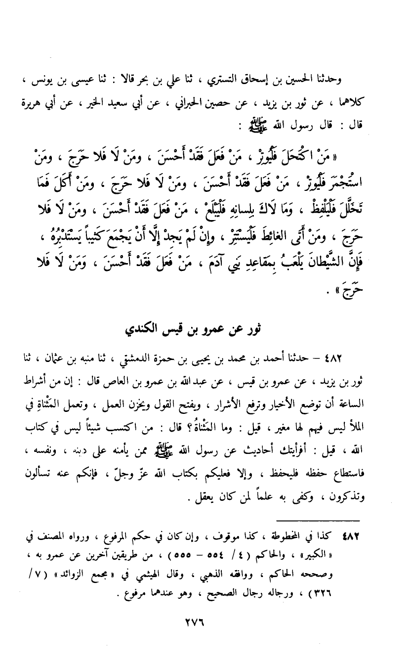 482 - حَدَّثَنَا أَحْمَدُ بْنُ مُحَمَّدِ بْنِ يَحْيَى بْنِ حَمْزَةَ الدِّمَشْقِيُّ، ثنا مُنَبِّهُ بْنُ عُثْمَانَ، ثنا ثَوْرُ بْنُ يَزِيدَ، عَنْ عَمْرِو بْنِ قَيْسٍ، عَنْ عَبْدِ اللَّهِ بْنِ عَمْرِو بْنِ الْعَاصِ، قَالَ: " إِنَّ §مِنْ أَشْرَاطِ السَّاعَةِ أَنْ تُوضَعَ الْأَخْيَارُ وَتُرْفَعَ الْأَشْرَارُ , وَيُفْتَحَ الْقَوْلُ , وَيُخْزَنَ الْعَمَلُ وَتَعْمَلَ الْمَثْنَاةُ فِي الْمَلَأِ لَيْسَ فِيهِمْ لَهَا مُغِيرٌ , قِيلَ: وَمَا الْمَثْنَاةُ؟ قَالَ: مَنِ اكْتَسَبَ شَيْئًا لَيْسَ فِي كِتَابِ اللَّهِ , قِيلَ: أَفَرَأَيْتَكَ أَحَادِيثَ عَنْ رَسُولِ اللَّهِ صَلَّى اللهُ عَلَيْهِ وَسَلَّمَ مِمَّنْ يَأْمَنُهُ عَلَى دِينِهِ وَنَفْسِهِ فَاسْتَطَاعَ حِفْظَهُ فَلْيَحْفَظْ , وَإِلَّا فَعَلَيْكُمْ بِكِتَابِ اللَّهِ عَزَّ وَجَلَّ؛ فَإِنَّكُمْ عَنْهُ تُسْأَلُونَ وَتَذْكُرُونَ وَكَفَى بِهِ عِلْمًا لِمَنْ كَانَ يَعْقِلُ "