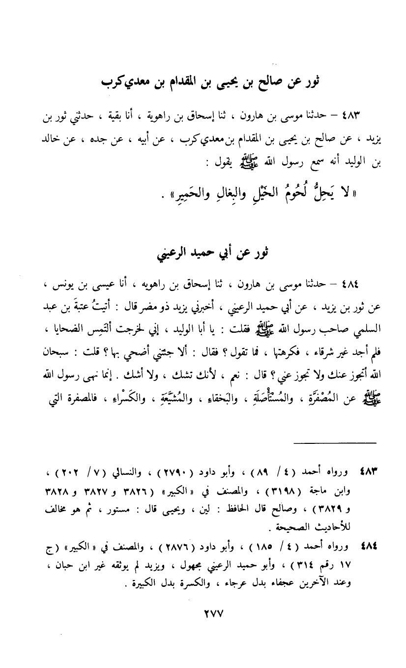 483 - حَدَّثَنَا مُوسَى بْنُ هَارُونَ، ثنا إِسْحَاقُ بْنُ رَاهَوَيْهِ، أَنَا بَقِيَّةُ، حَدَّثَنِي ثَوْرُ بْنُ يَزِيدَ، عَنْ صَالِحِ بْنِ يَحْيَى بْنِ الْمِقْدَامِ بْنِ مَعْدِي كَرِبَ , عَنْ أَبِيهِ، عَنْ جَدِّهِ، عَنْ خَالِدِ بْنِ الْوَلِيدِ، أَنَّهُ سَمِعَ رَسُولَ اللَّهِ صَلَّى اللهُ عَلَيْهِ وَسَلَّمَ يَقُولُ: §«لَا يَحِلُّ لُحُومُ الْخَيْلِ وَالْبِغَالِ وَالْحَمِيرِ»