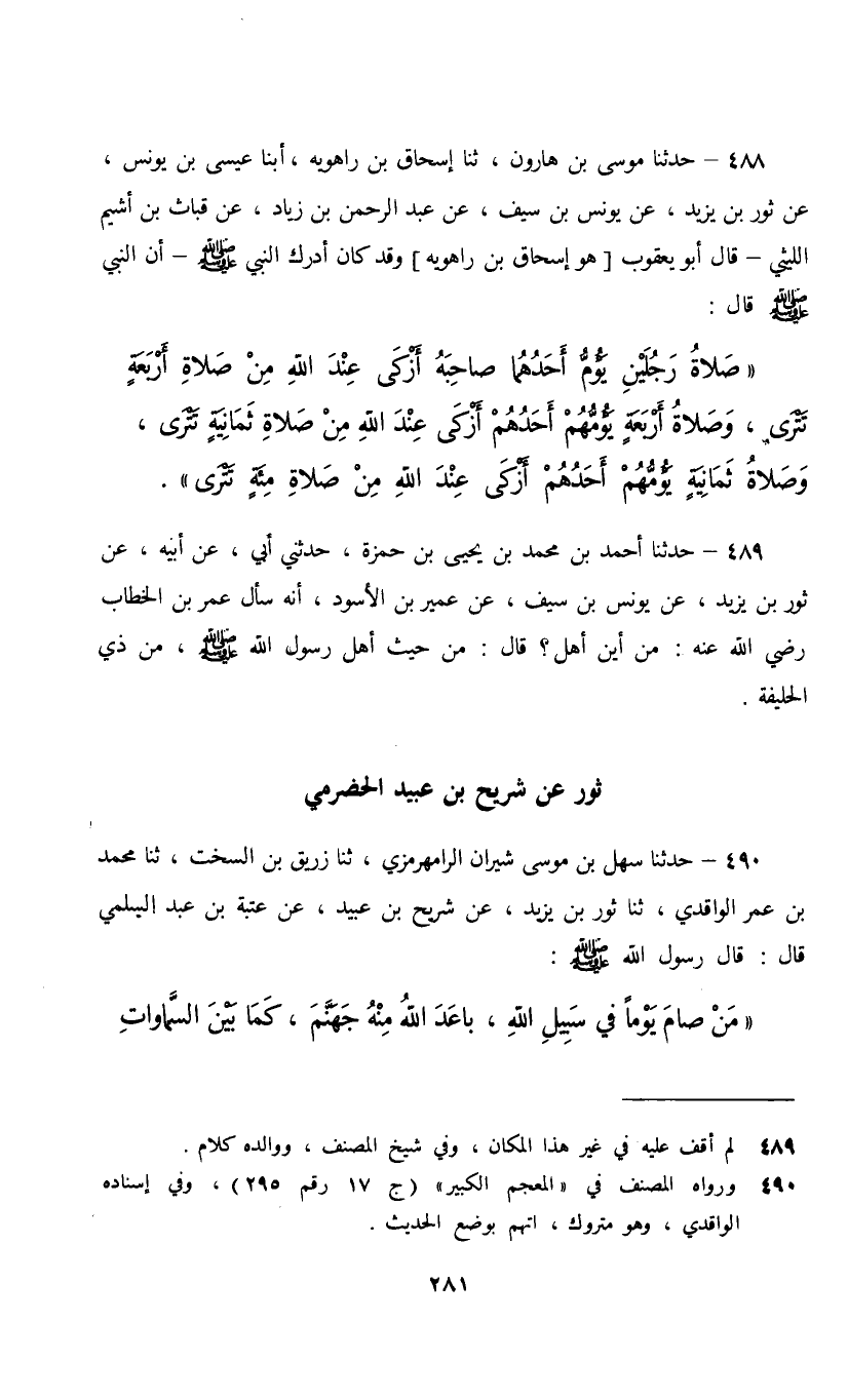 488 - حَدَّثَنَا مُوسَى بْنُ هَارُونَ، ثنا إِسْحَاقُ بْنُ رَاهَوَيْهِ، أَبَنَا عِيسَى بْنُ يُونُسَ , عَنْ ثَوْرِ بْنِ يَزِيدَ، عَنْ يُونُسَ بْنِ سَيْفٍ، عَنْ عَبْدِ الرَّحْمَنِ بْنِ زِيَادٍ، عَنْ قَبَاثِ بْنِ أَشْيَمَ اللَّيْثِيِّ، قَالَ: أَبُو يَعْقُوبَ [هُوَ إِسْحَاقُ بْنُ رَاهَوَيْهِ] ، وَقَدْ كَانَ أَدْرَكَ النَّبِيَّ صَلَّى اللهُ عَلَيْهِ وَسَلَّمَ أَنَّ النَّبِيَّ صَلَّى اللهُ عَلَيْهِ وَسَلَّمَ قَالَ: §«صَلَاةُ رَجُلَيْنِ يَؤُمُّ أَحَدُهُمَا صَاحِبَهُ أَزْكَى عِنْدَ اللَّهِ مِنْ صَلَاةِ أَرْبَعَةٍ تَتْرَى , وَصَلَاةُ أَرْبَعَةٍ يَؤُمُّهُمْ أَحَدُهُمْ أَزْكَى عِنْدَ اللَّهِ مِنْ صَلَاةِ ثَمَانِيَةٍ تَتْرَى , وَصَلَاةُ ثَمَانِيَةٍ يَؤُمُّهُمْ أَحَدُهُمْ أَزْكَى عِنْدَ اللَّهِ مِنْ صَلَاةِ مِائَةٍ تَتْرَى»