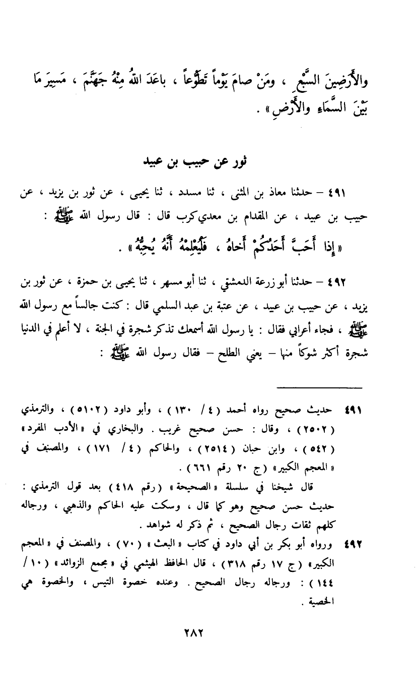 491 - حَدَّثَنَا مُعَاذُ بْنُ الْمُثَنَّى، ثنا مُسَدَّدٌ، ثنا يَحْيَى، عَنْ ثَوْرِ بْنِ يَزِيدَ، عَنْ حَبِيبِ بْنِ عُبَيْدٍ، عَنِ الْمِقْدَامِ بْنِ مَعْدِي كَرِبَ , قَالَ: قَالَ رَسُولُ اللَّهِ صَلَّى اللهُ عَلَيْهِ وَسَلَّمَ: §«إِذَا أَحَبَّ أَحَدُكُمْ أَخَاهُ فَلْيُعْلِمْهُ أَنَّهُ يُحِبُّهُ»