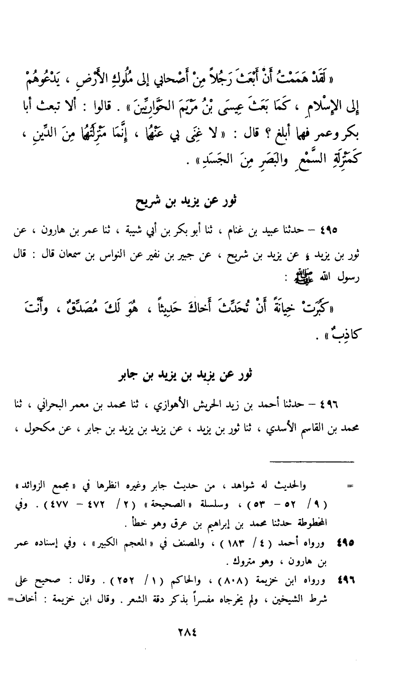 495 - حَدَّثَنَا عُبَيْدُ بْنُ غَنَّامٍ، ثنا أَبُو بَكْرِ بْنُ أَبِي شَيْبَةَ، ثنا عُمَرُ بْنُ هَارُونَ، عَنْ ثَوْرِ بْنِ يَزِيدَ، عَنْ يَزِيدَ بْنِ شُرَيْحٍ، عَنْ جُبَيْرِ بْنِ نُفَيْرٍ، عَنِ النَّوَّاسِ بْنِ سَمْعَانَ، قَالَ: قَالَ رَسُولُ اللَّهِ صَلَّى اللهُ عَلَيْهِ وَسَلَّمَ §«كَبُرَتْ خِيَانَةً أَنْ تُحَدِّثَ أَخَاكَ حَدِيثًا هُوَ لَكَ مُصَدِّقٌ وَأَنْتَ كَاذِبٌ»
