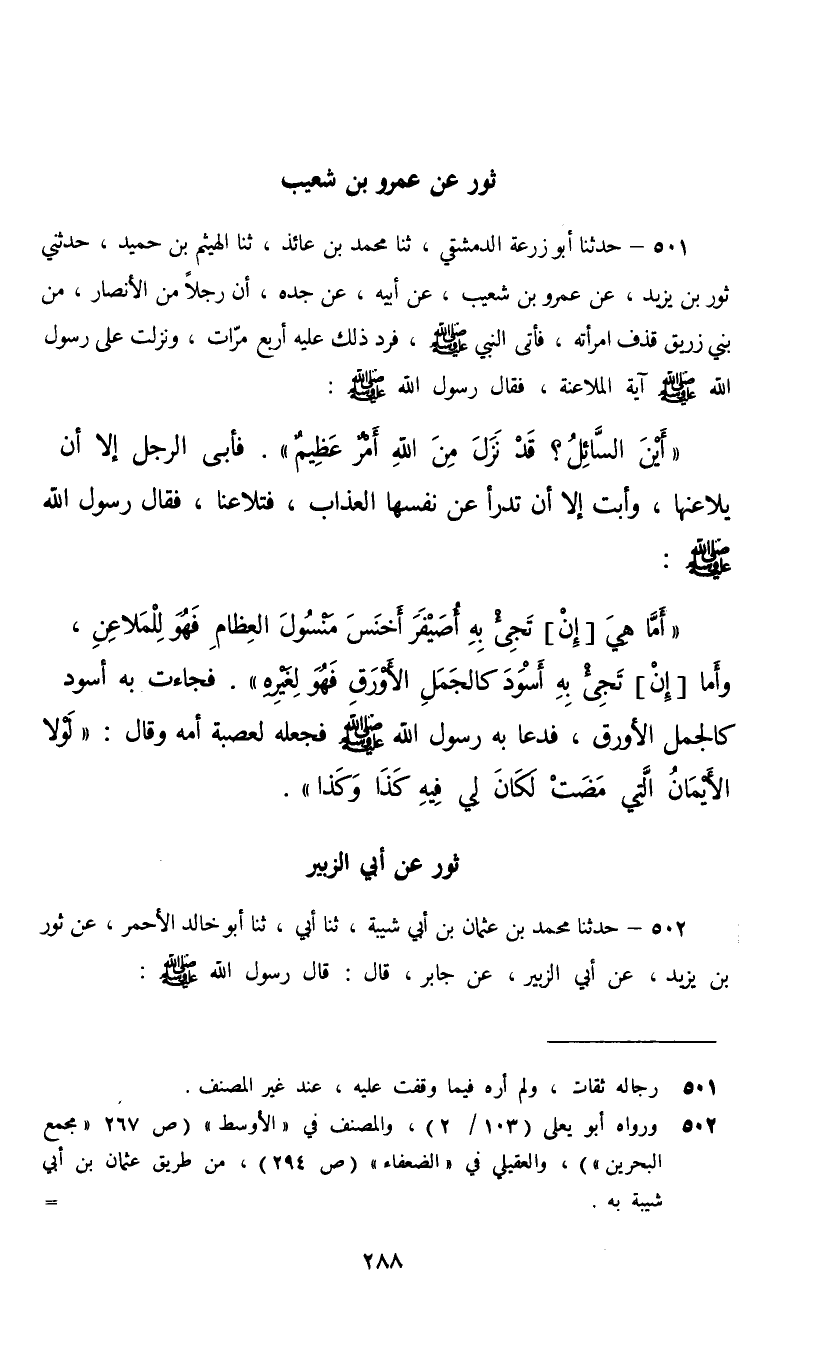 501 - حَدَّثَنَا أَبُو زُرْعَةَ الدِّمَشْقِيُّ، ثنا مُحَمَّدُ بْنُ عَائِذٍ، ثنا الْهَيْثَمُ بْنُ حُمَيْدٍ، حَدَّثَنِي ثَوْرُ بْنُ يَزِيدَ، عَنْ عَمْرِو بْنِ شُعَيْبٍ، عَنْ أَبِيهِ، عَنْ جَدِّهِ، أَنَّ رَجُلًا، مِنَ الْأَنْصَارِ مِنْ بَنِي زُرَيْقٍ قَذَفَ امْرَأَتَهُ فَأَتَى النَّبِيَّ صَلَّى اللهُ عَلَيْهِ وَسَلَّمَ فَرَدَّ ذَلِكَ عَلَيْهِ أَرْبَعَ مَرَّاتٍ وَنَزَلَتْ عَلَى رَسُولِ اللَّهِ صَلَّى اللهُ عَلَيْهِ وَسَلَّمَ آيَةُ الْمُلَاعَنَةِ , فَقَالَ رَسُولُ اللَّهِ صَلَّى اللهُ عَلَيْهِ وَسَلَّمَ: «أَيْنَ السَّائِلُ؟ قَدْ نَزَلَ مِنَ اللَّهِ أَمْرٌ عَظِيمٌ» فَأَبَى الرَّجُلُ إِلَّا أَنْ يُلَاعِنَهَا وَأَبَتْ إِلَّا أَنْ تَدْرَأَ عَنْ نَفْسِهَا الْعَذَابَ فَتَلَاعَنَا , فَقَالَ رَسُولُ اللَّهِ صَلَّى اللهُ عَلَيْهِ وَسَلَّمَ: " أَمَّا هِيَ §[إِنْ] تَجِيءْ بِهِ أُصَيْفِرَ أَخْنَسَ مَنْسُولَ الْعِظَامِ فَهُوَ لِلْمُلَاعِنَ وَأَمَّا [إِنْ] تَجِئْ بِهِ أَسْوَدَ كَالْجَمَلِ الْأَوْرَقِ فَهُوَ لِغَيْرِهِ , فَجَاءَتْ بِهِ أَسْوَدَ كَالْجَمَلِ الْأَوْرَقِ فَدَعَا بِهِ رَسُولُ اللَّهِ صَلَّى اللهُ عَلَيْهِ وَسَلَّمَ فَجَعَلَهُ لِعَصَبَةِ أُمِّهِ وَقَالَ: لَوْلَا الْأَيْمَانُ الَّتِي مَضَتْ لَكَانَ لِي فِيهِ كَذَا وَكَذَا"