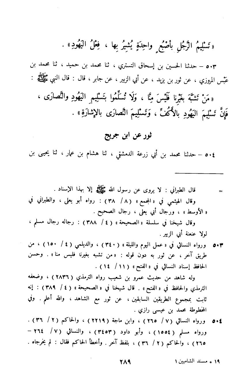 503 - حَدَّثَنَا الْحُسَيْنُ بْنُ إِسْحَاقَ التُّسْتَرِيُّ، ثنا مُحَمَّدُ بْنُ حُمَيْدٍ، ثنا مُحَمَّدُ بْنُ عَبْسٍ الْمَرْوَزِيُّ، عَنْ ثَوْرِ بْنِ يَزِيدَ، عَنْ أَبِي الزُّبَيْرِ، عَنْ جَابِرٍ، قَالَ: قَالَ النَّبِيُّ صَلَّى اللهُ عَلَيْهِ وَسَلَّمَ: §«مَنْ تَشَبَّهَ بِغَيْرِنَا فَلَيْسَ مِنَّا , وَلَا تُسَلِّمُوا بِتَسْلِيمِ الْيَهُوَدِ وَالنَّصَارَى , فَإِنَّ تَسْلِيمَ الْيَهُوَدِ بِالْأَكُفِّ , وَتَسْلِيمَ النَّصَارَى بِالْإِشَارَةِ»