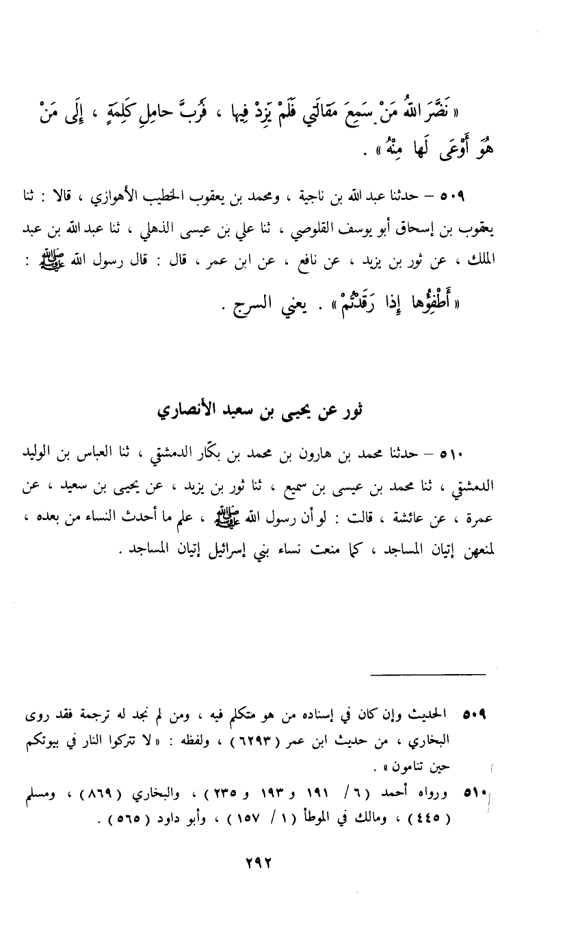 509 - حَدَّثَنَا عَبْدُ اللَّهِ بْنُ نَاجِيَةَ، وَمُحَمَّدُ بْنُ يَعْقُوبَ الْخَطِيبُ الْأَهْوَازِيُّ , قَالَا: ثنا يَعْقُوبُ بْنُ إِسْحَاقَ أَبُو يُوسُفَ الْقَلُوسِيُّ، ثنا عَلِيُّ بْنُ عِيسَى الذُّهْلِيُّ، ثنا عَبْدُ اللَّهِ بْنُ عَبْدِ الْمَلِكِ، عَنْ ثَوْرِ بْنِ يَزِيدَ، عَنْ نَافِعٍ، عَنِ ابْنِ عُمَرَ، قَالَ: قَالَ رَسُولُ اللَّهِ صَلَّى اللهُ عَلَيْهِ وَسَلَّمَ: §«أَطْفِؤُهَا إِذَا رَقَدْتُمْ» يَعْنِي السُّرُجَ