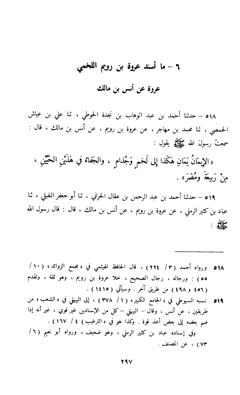 518 - حَدَّثَنَا أَحْمَدُ بْنُ عَبْدِ الْوَهَّابِ بْنِ نَجْدَةَ الْحَوْطِيُّ، ثنا عَلِيُّ بْنُ عَيَّاشٍ الْحِمْصِيُّ، ثنا مُحَمَّدُ بْنُ مُهَاجِرٍ، عَنْ عُرْوَةَ بْنِ رُوَيْمٍ , عَنْ أَنَسِ بْنِ مَالِكٍ، قَالَ: سَمِعْتُ رَسُولَ اللَّهِ صَلَّى اللهُ عَلَيْهِ وَسَلَّمَ يَقُولُ: «§الْإِيمَانُ يَمَانٍ هَكَذَا إِلَى لَخْمٍ وَجُذَامٍ , وَالْجَفَاءُ فِي هَذَيْنِ الْحَيَّيْنِ مِنْ رَبِيعَةَ وَمُضَرَ»