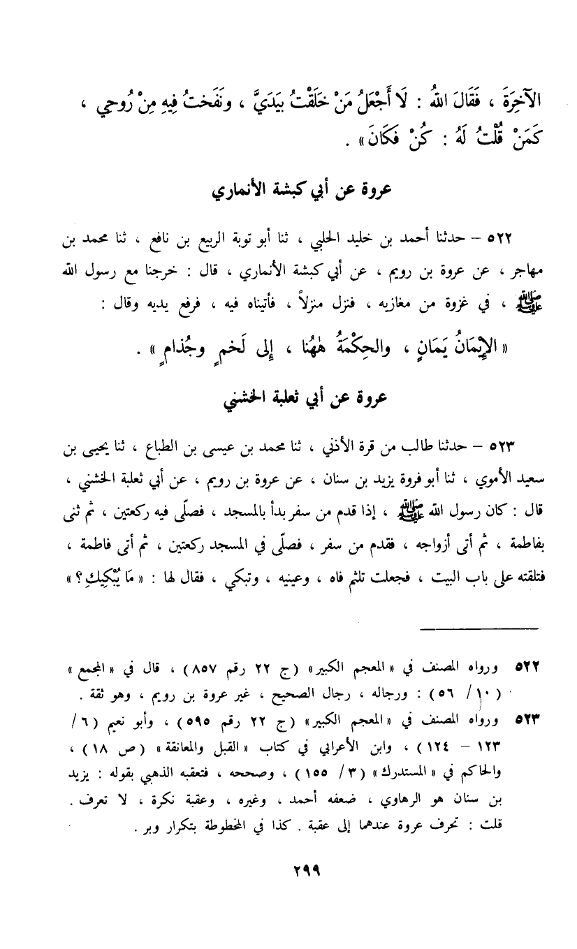522 - حَدَّثَنَا أَحْمَدُ بْنُ خُلَيْدٍ الْحَلَبِيُّ، ثنا أَبُو تَوْبَةَ الرَّبِيعُ بْنُ نَافِعٍ، ثنا مُحَمَّدُ بْنُ مُهَاجِرٍ، عَنْ عُرْوَةَ بْنِ رُوَيْمٍ , عَنْ أَبِي كَبْشَةَ الْأَنْمَارِيِّ، قَالَ: خَرَجْنَا مَعَ رَسُولِ اللَّهِ صَلَّى اللهُ عَلَيْهِ وَسَلَّمَ فِي غَزْوَةٍ مِنْ مَغَازِيهِ فَنَزَلَ مَنْزِلًا فَأَتَيْنَاهُ فِيهِ فَرَفَعَ يَدَيْهِ وَقَالَ: «§الْإِيمَانُ يَمَانٍ , وَالْحِكْمَةُ هَهُنَا إِلَى لَخْمٍ وَجُذَامٍ»