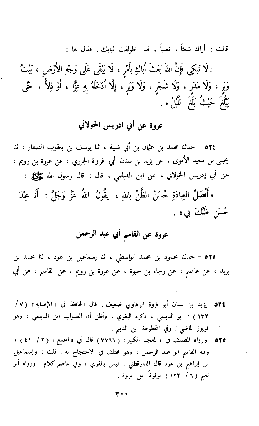 524 - حَدَّثَنَا مُحَمَّدُ بْنُ عُثْمَانَ بْنِ أَبِي شَيْبَةَ، ثنا يُوسُفُ بْنُ يَعْقُوبَ الصَّفَّارُ، ثنا يَحْيَى بْنُ سَعِيدٍ الْأُمَوِيُّ، عَنْ يَزِيدَ بْنِ سِنَانٍ أَبِي فَرْوَةَ الْجَزَرِيِّ، عَنْ عُرْوَةَ بْنِ رُوَيْمٍ , عَنْ أَبِي إِدْرِيسَ الْخَوْلَانِيِّ، عَنِ ابْنِ الدَّيْلَمِيِّ، قَالَ: قَالَ رَسُولُ اللَّهِ صَلَّى اللهُ عَلَيْهِ وَسَلَّمَ: " أَفْضَلُ الْعِبَادَةِ حُسْنُ الظَّنِّ بِاللَّهِ يَقُولُ اللَّهُ عَزَّ وَجَلَّ: §«أَنَا عِنْدَ حُسْنِ ظَنِّكَ بِي»