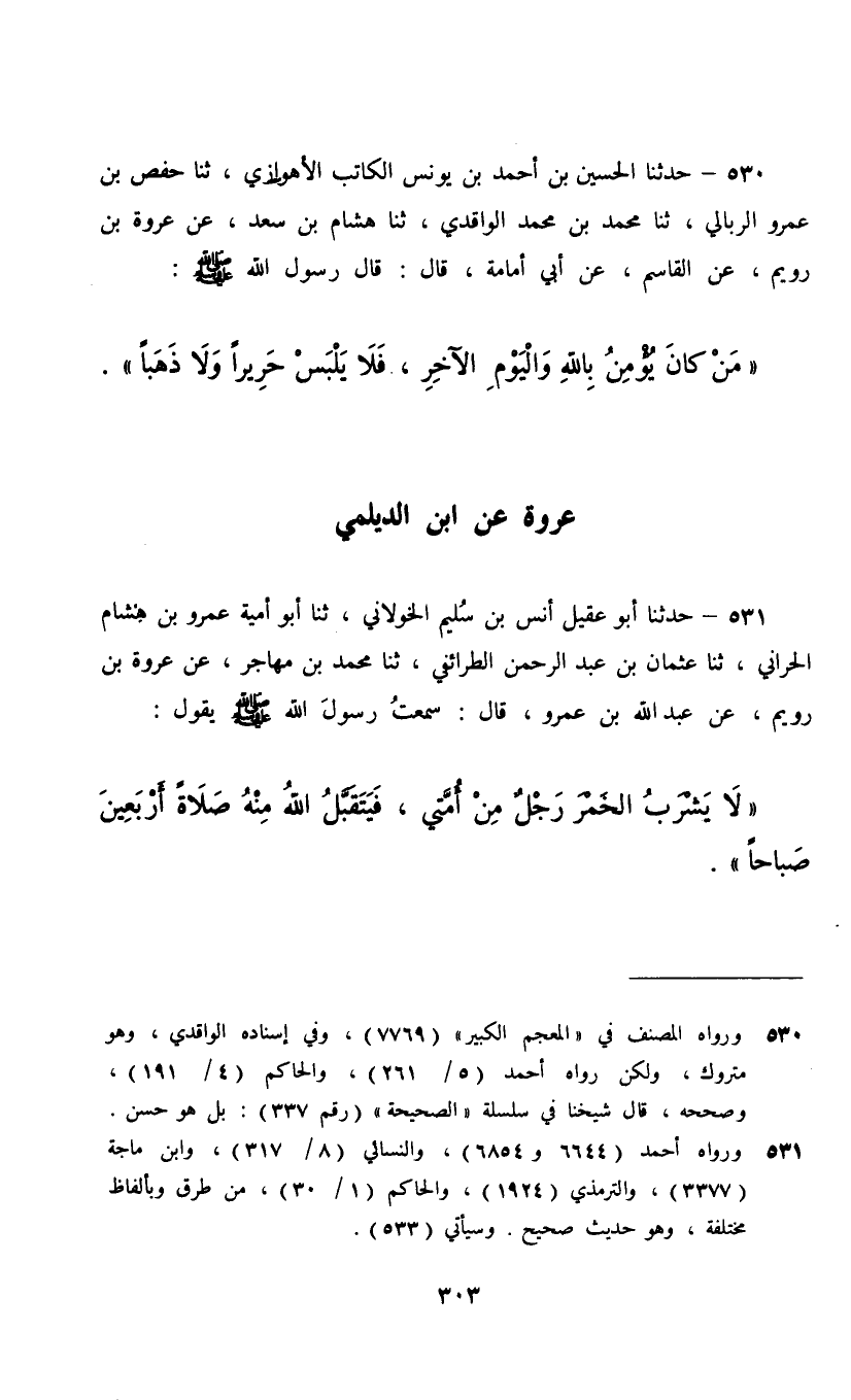 530 - حَدَّثَنَا الْحُسَيْنُ بْنُ أَحْمَدَ بْنِ يُونُسَ الْكَاتِبُ الْأَهْوَازِيُّ، ثنا حَفْصُ بْنُ عَمْرٍو الرَّبَالِيُّ، ثنا مُحَمَّدُ بْنُ مُحَمَّدٍ الْوَاقِدِيُّ، ثنا هِشَامُ بْنُ سَعْدٍ، عَنْ عُرْوَةَ بْنِ رُوَيْمٍ , عَنِ الْقَاسِمِ، عَنْ أَبِي أُمَامَةَ، قَالَ: قَالَ رَسُولُ اللَّهِ صَلَّى اللهُ عَلَيْهِ وَسَلَّمَ: §«مَنْ كَانَ يُؤْمِنُ بِاللَّهِ وَالْيَوْمِ الْآخِرِ فَلَا يَلْبَسُ حَرِيرًا , وَلَا ذَهَبًا»